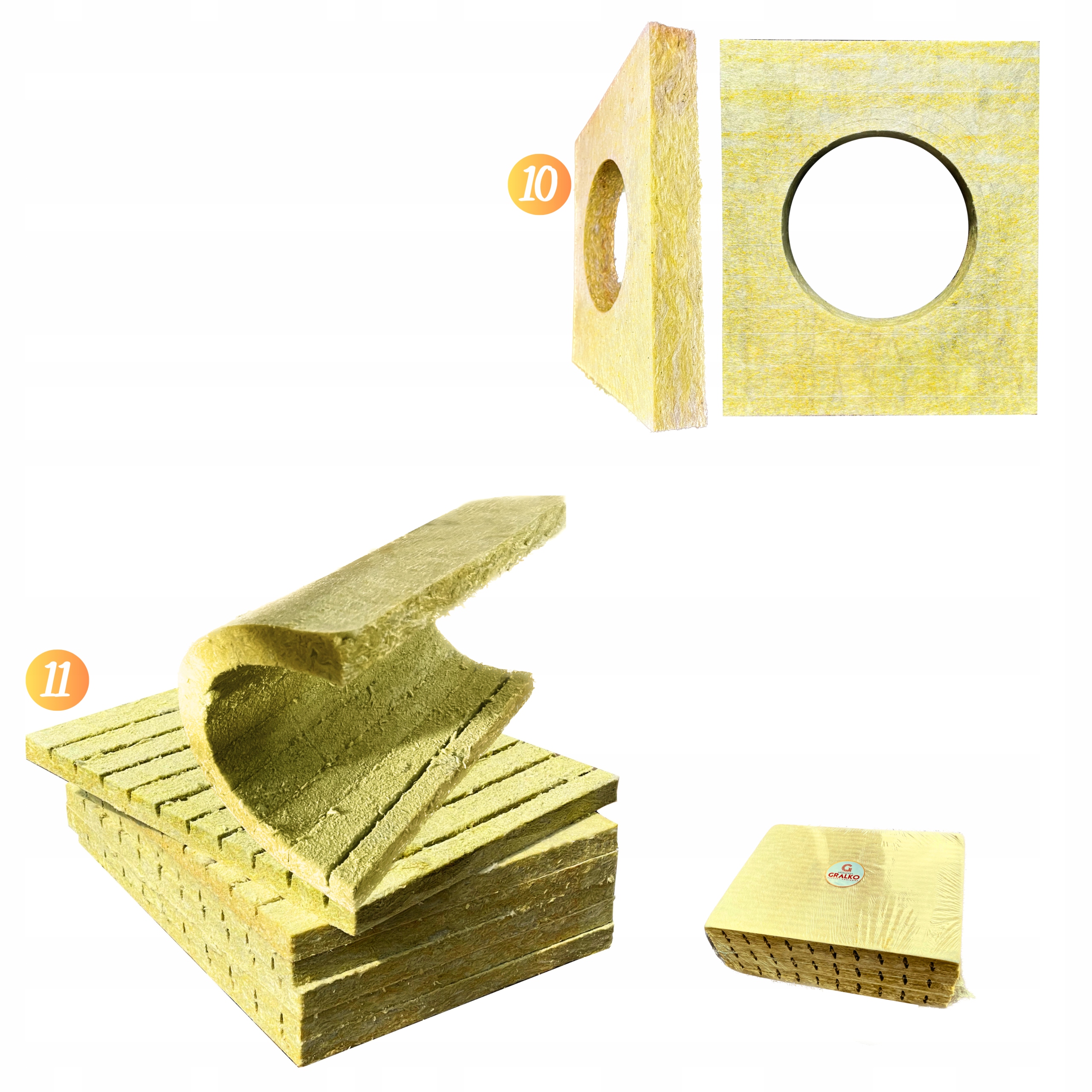 Вата гидрофобизирована (покрыта гидрофобной пропиткой, препятствующей проникновению воды в структуру материала) и фрезерована (отлично покрывает керамическую вставку, предотвращая образование тепловых мостов). Теплопроводность λ: ≤ 0,036 Вт/мК. Температура нанесения: до 800°C. Класс пожарной безопасности: А1 (негорючий продукт и не распространяет огонь)