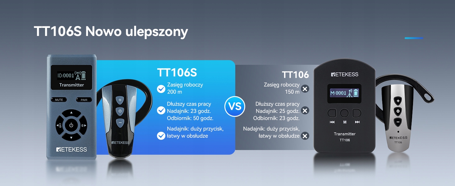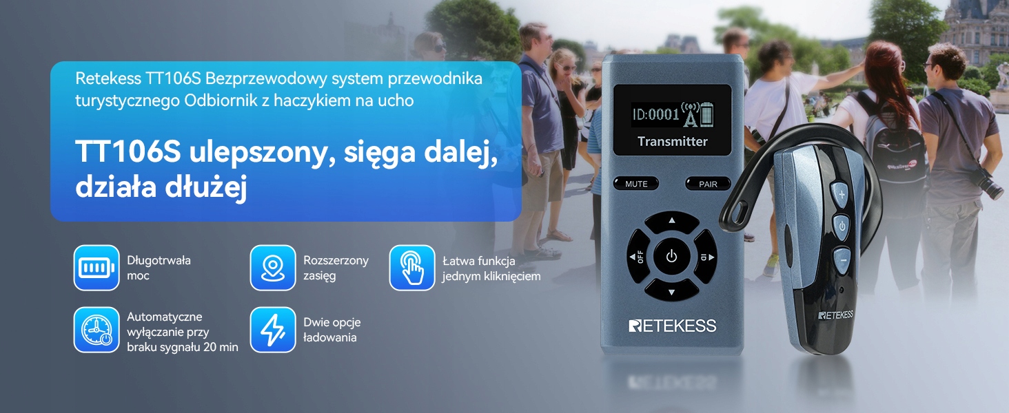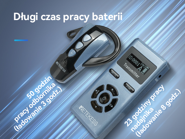 - Ультрарада -Сервис РАБОТА; earhook Guide Guide Preeriver может похвастаться сроком службы батареи до 50 часов; передатчик TT106S имеет срок службы батареи до 23 часа