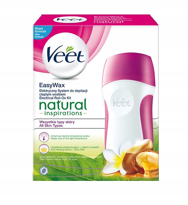 Новая система депиляции Veet EasyWax™ Natural Inspirations™ с электрическим теплым воском содержит >90%* ингредиентов натурального происхождения. Это простая в использовании система депиляции теплым воском, обеспечивающая длительную гладкость кожи на срок до 28 дней. Формула содержит смолу сосны и натуральное масло граната, известное своими увлажняющими свойствами, благодаря чему кожа после депиляции становится заметно увлажненной и гладкой. Продукт прошел дерматологические испытания.