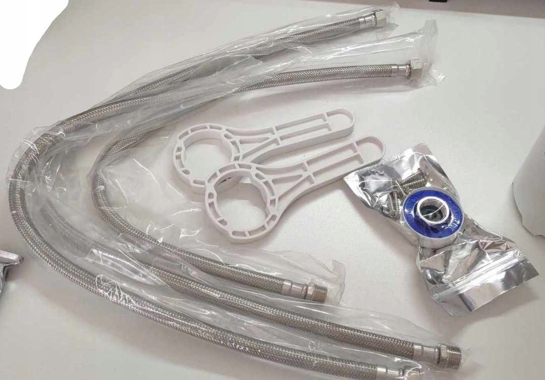В комплект также входят два дополнительных шланга большей длины. Совместим со стандартной установкой 3/8", в комплект входит переходник на 1/2".