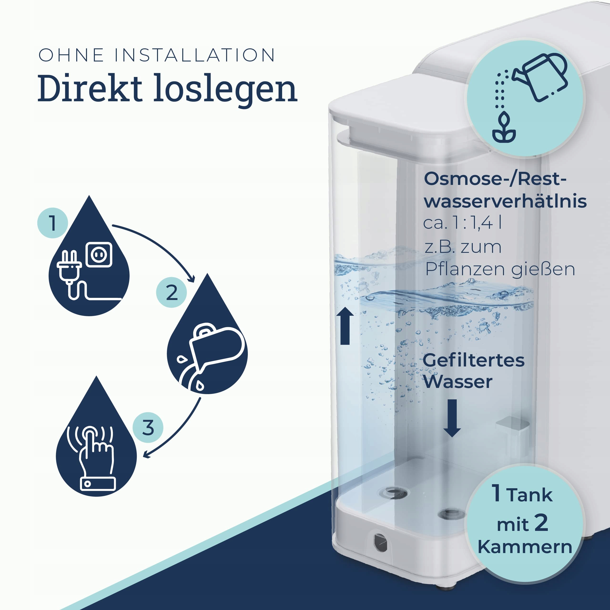 𝘼𝙣𝙨𝙘𝙝𝙡𝙞𝙚ss𝙚𝙣. 𝘼𝙪𝙛𝙛ue𝙡𝙡𝙚𝙣. 𝘼𝙪𝙨𝙬ae𝙝𝙡𝙚𝙣. - Три простых шага к самой чистой осмотической воде. Без бурения и прикручивания просто подключите систему к электричеству, заполните съемный резервуар для воды и накачивайте воду при желаемой температуре. Кроме того, мобильная система фильтрации воды может быть легко установлена в разных местах, будь то на кухне, в офисе, в путешествиях, в доме на колесах или в доме отдыха