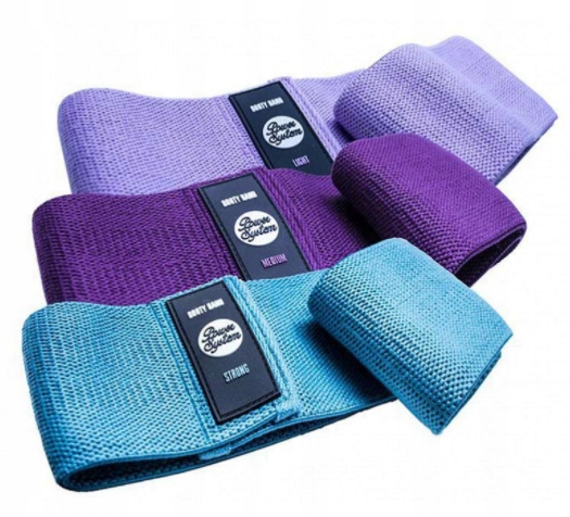 Набор полосы силовой системы. Ленты предлагают другую степень сопротивления: синий - тяжелый, фиолетовый - средний, розовый - свет. Дифференциация уровней сопротивления позволяет правильно скорректировать уровень сложности во время тренировки, независимо от стадии упражнений. бедра