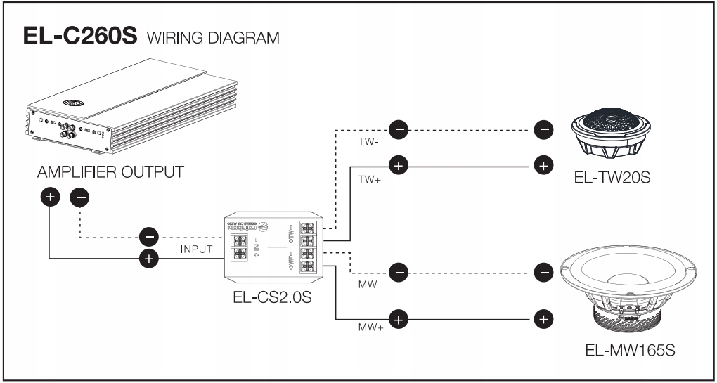 Благодаря широкой частотной характеристике. 65 Гц - 20 кГц и чувствительность 87 дБ, EL-C260S обеспечивает стабильный, сбалансированный звук с четкой сценой и отличным разделением. Как в тихих песнях, так и в динамичных композициях система сохраняет полный контроль.