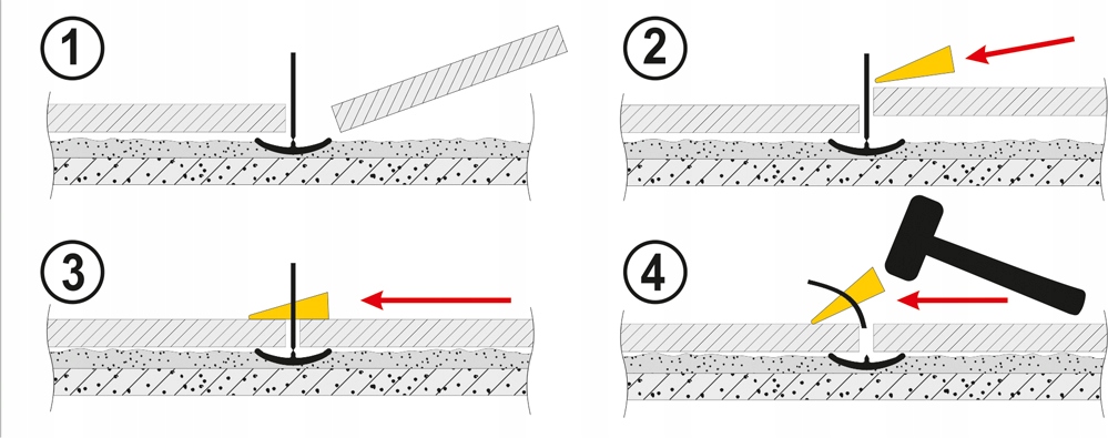 1. После нанесения клея вставьте зажимы под плитку так, чтобы с каждой стороны плитки было по два зажима. 2. Придвиньте еще одну плитку к зажимам. 3. Вставьте клин в отверстие зажима и нажмите, чтобы выровнять плитки. 4. После затвердевания плиточного раствора (клея) снимите зажим, слегка постучав по нему.
