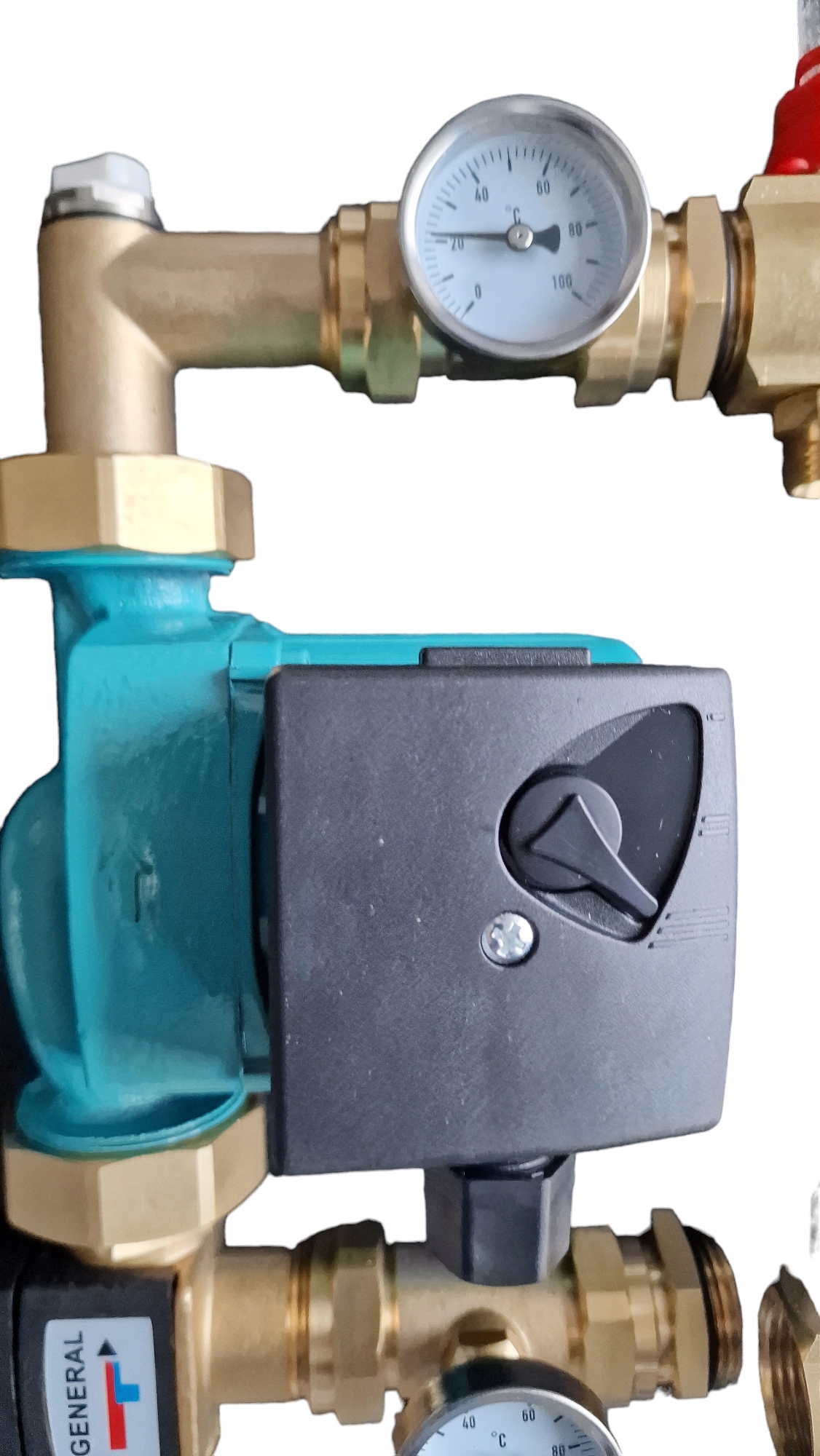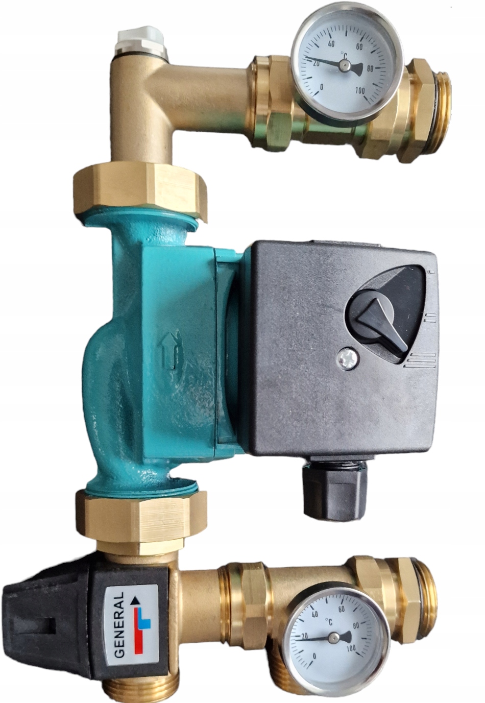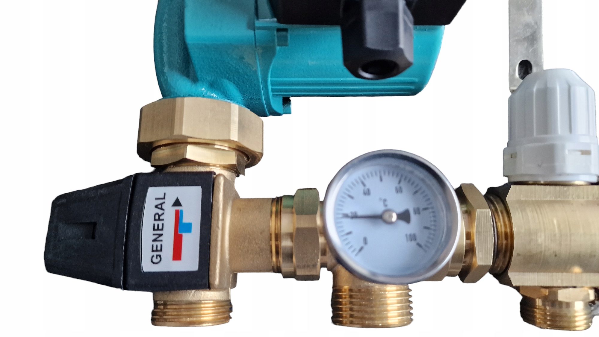 Группа оснащена термостатическим клапаном, который после установки заданной температуры подает ее в коллектор (установку) в соответствии с настройкой клапана. Защищает систему от перегрева.
