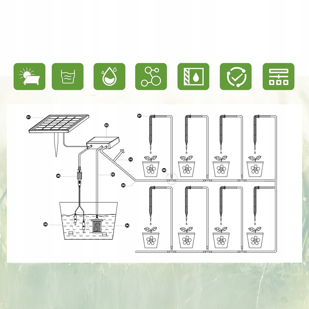 Солнечная панель и ирригационное компьютер имеют разделенную структуру, которая делает поливание более удобным и имеет более широкий диапазон приложений. Подходит для автоматического орошения растений при орошении газонов, внутренних дворов, садов, орошения овощей, подвесных корзин, горшечных растений, цветочных слоев, теплиц и других мест.