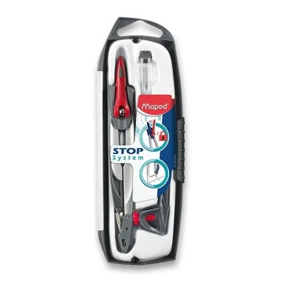 Solid, металлический цирк Stop System Французская компания Maped . У него есть совет по написанию графита. В целом закрыто в пластиковом корпусе в наборе с 2 элементами: универсальная ручка для карандашей и запасной графит. Запатентованная система блокировки плеч в определенном положении. Специальное наложение иглы защищает от резки.