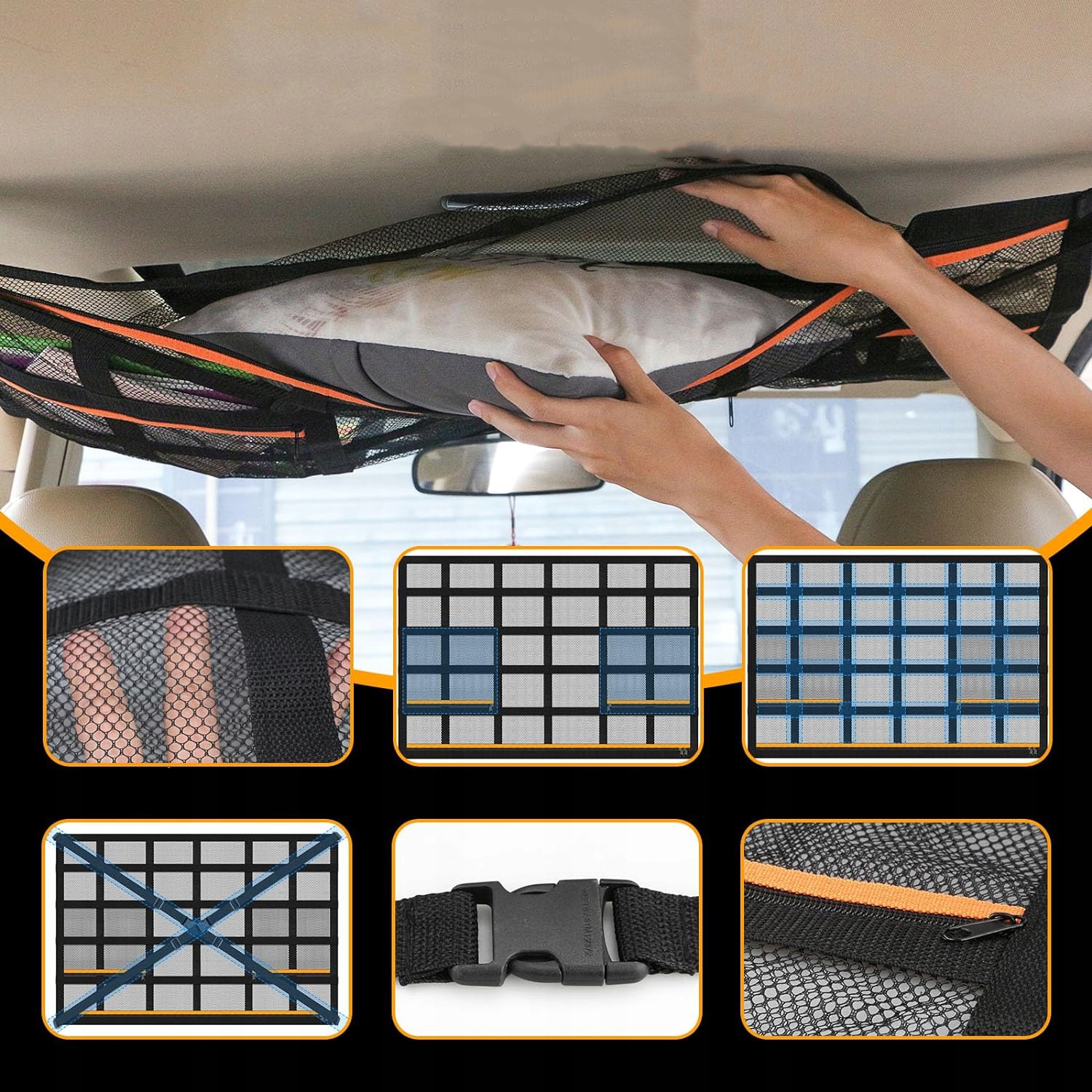 🚗【Простая установка】Автомобиль, требующий четырех ручек] Потолочная сумка для хранения оснащена 4 фиксирующими пряжками, который можно использовать для защиты бардачка автомобиля. Просто держите застежку и застегните ремень, застегните защелку, автомобильный держатель находится над головой. Более того, он достаточно прочный, чтобы без повреждений переносить обычные предметы.