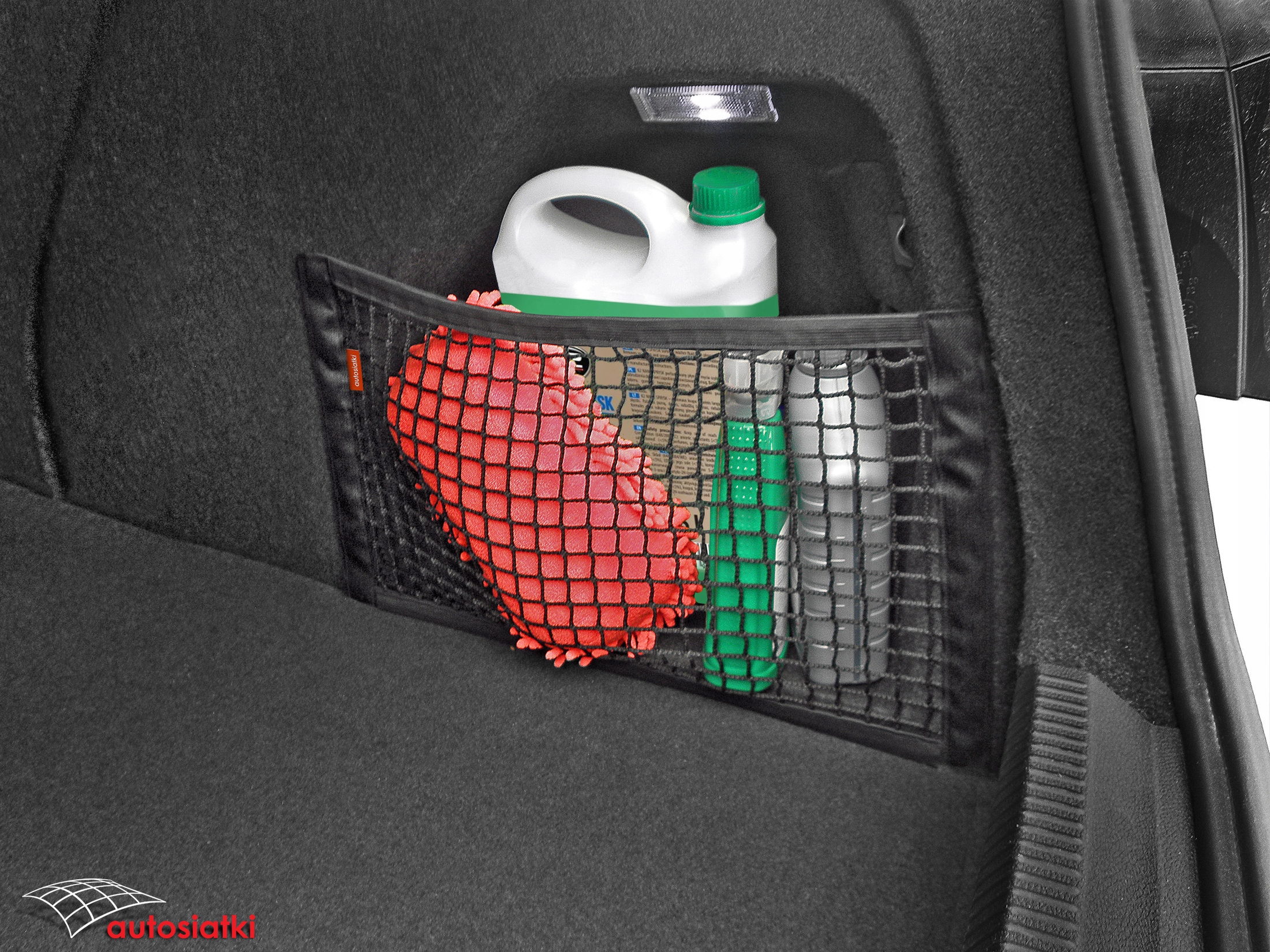 Это прочная сетка с лентой-липучкой по бокам. Отделка гибкой резиной сверху и снизу, что позволяет подогнать сетку под транспортируемые предметы. Ограждение крепится к ковру в багажнике или салоне автомобиля.