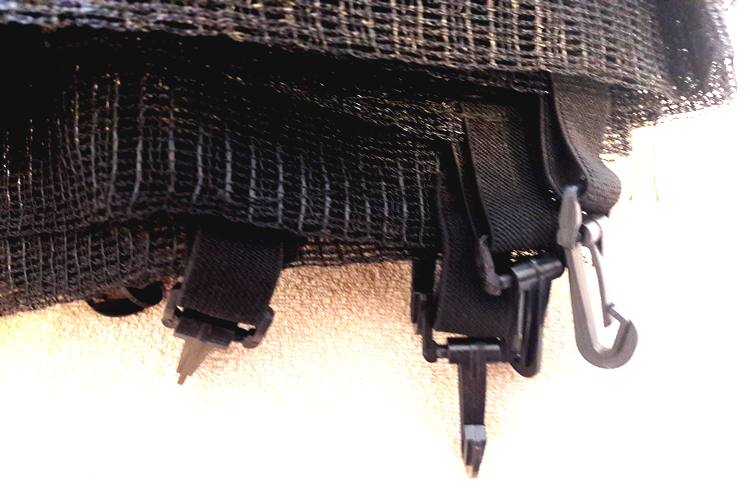 Сетка выходит за рамки каркаса и крепится снизу крючками (на резинках) к треугольникам на батутном коврике. Прочная молния дополнительно закрепляется пряжками. Важно, чтобы эта сетка не была привязана к столбам, а накрыта специальными чехлами. Благодаря этому используется вся поверхность батута, а пенопласт на стойках защищен от повреждений.