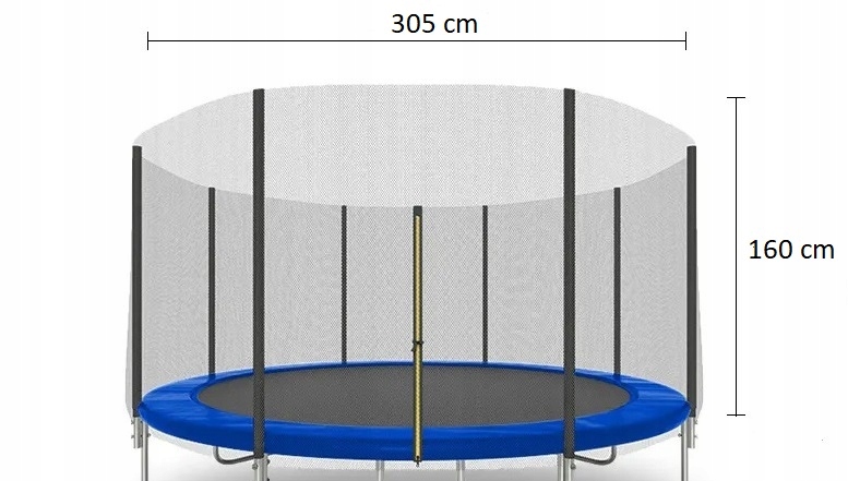 Рекомендую новую внешнюю защитную сетку для батута диаметром от 304 до 312 см (10 Ft - ft), с 3 двойными ножками, с 6 опорами - как на фотографиях ниже. Высота всей сетки: 160 см. Туннели для столбов соответственно короче – около 10 см. Он изготовлен из полиэтиленовой лески (например, лески), что делает его очень прочным – лучшим на рынке. Он не тускнеет и не крошится даже спустя годы. Сетки очень плотные, плотность увеличена до 105г/кв.м.