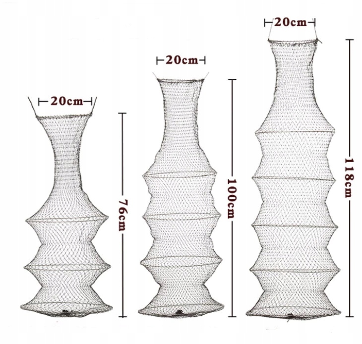 Рыболовная сеть длиной 76 см состоит из 4 колец: одно более узкое вверху, около 22 см, и три более широких внизу, около 35 см.