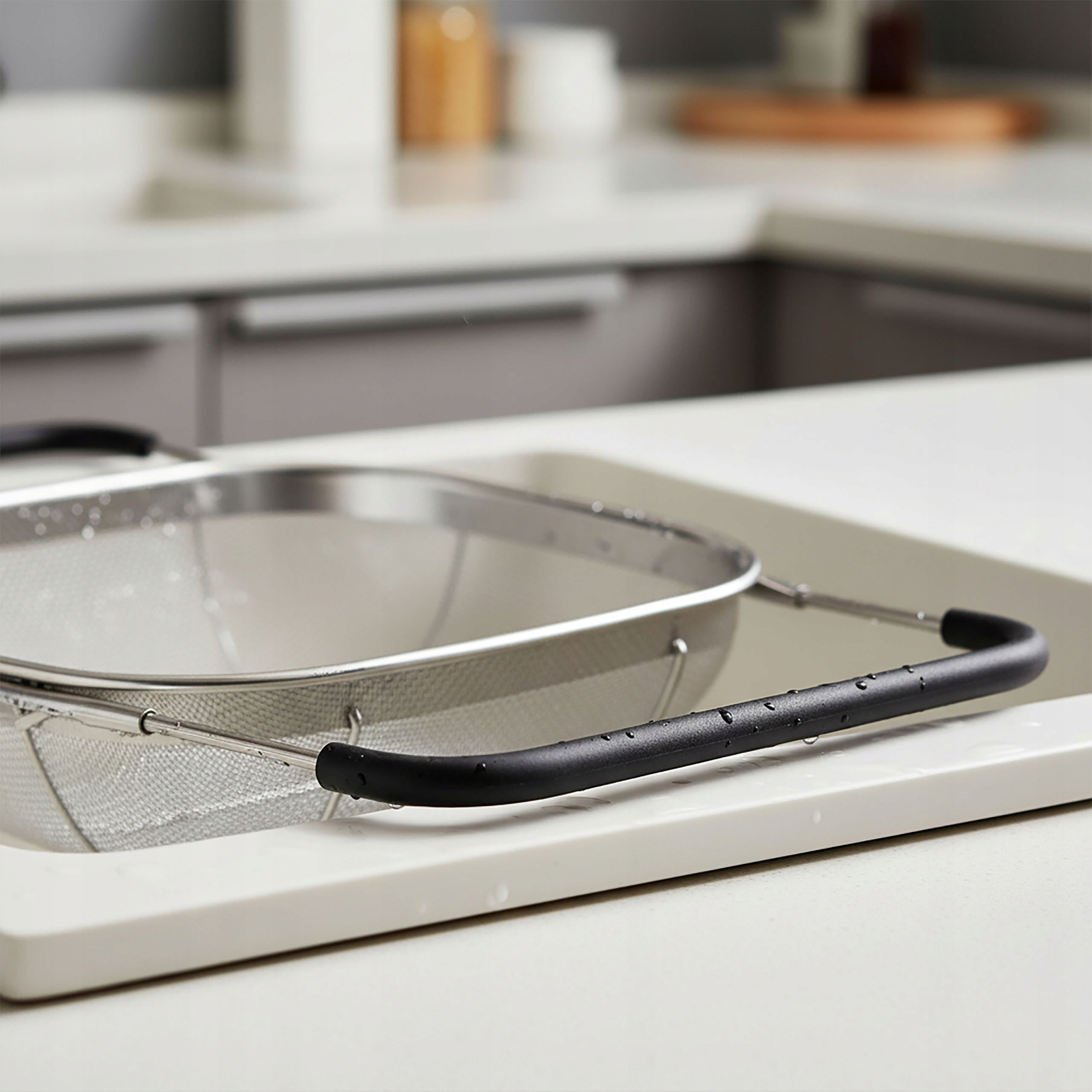 Ручки, покрытые черной резиной, гарантируют, что дуршлаг устойчиво лежит на краях раковины и не смещается во время использования.
