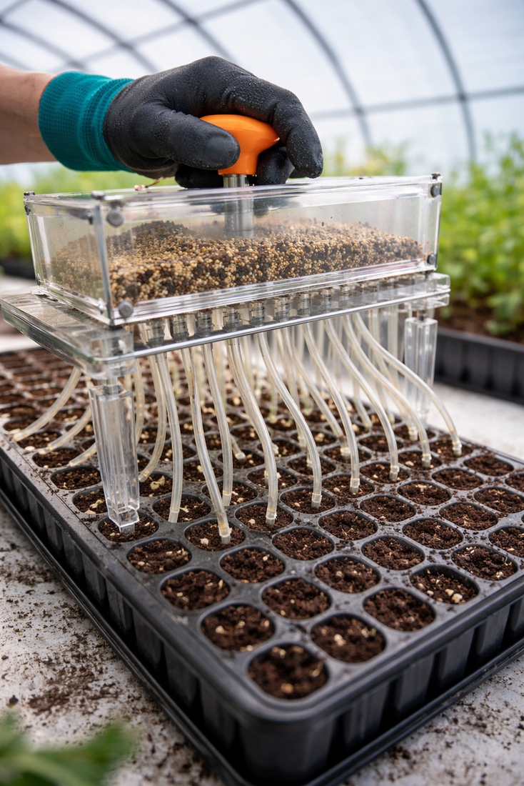 4️⃣ Выполните посев — система трубок доставит семена в каждую ячейку.