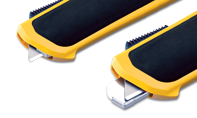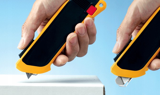 - Нож, предназначенный для людей, работающих в местах, где часто разрезана картонная упаковка: в супермаркетах, складах, на технологических линиях и т. Д. Ручка после того, как движется вперед на ползунке, расположенном в верхней части ручки; Слайдер (и, следовательно, и, следовательно, лезвие) в выступающем положении; Максимальная выступление лезвия: 10 мм; Лезвие заменяется способом, показанным на иллюстрации и не требует дополнительных инструментов.