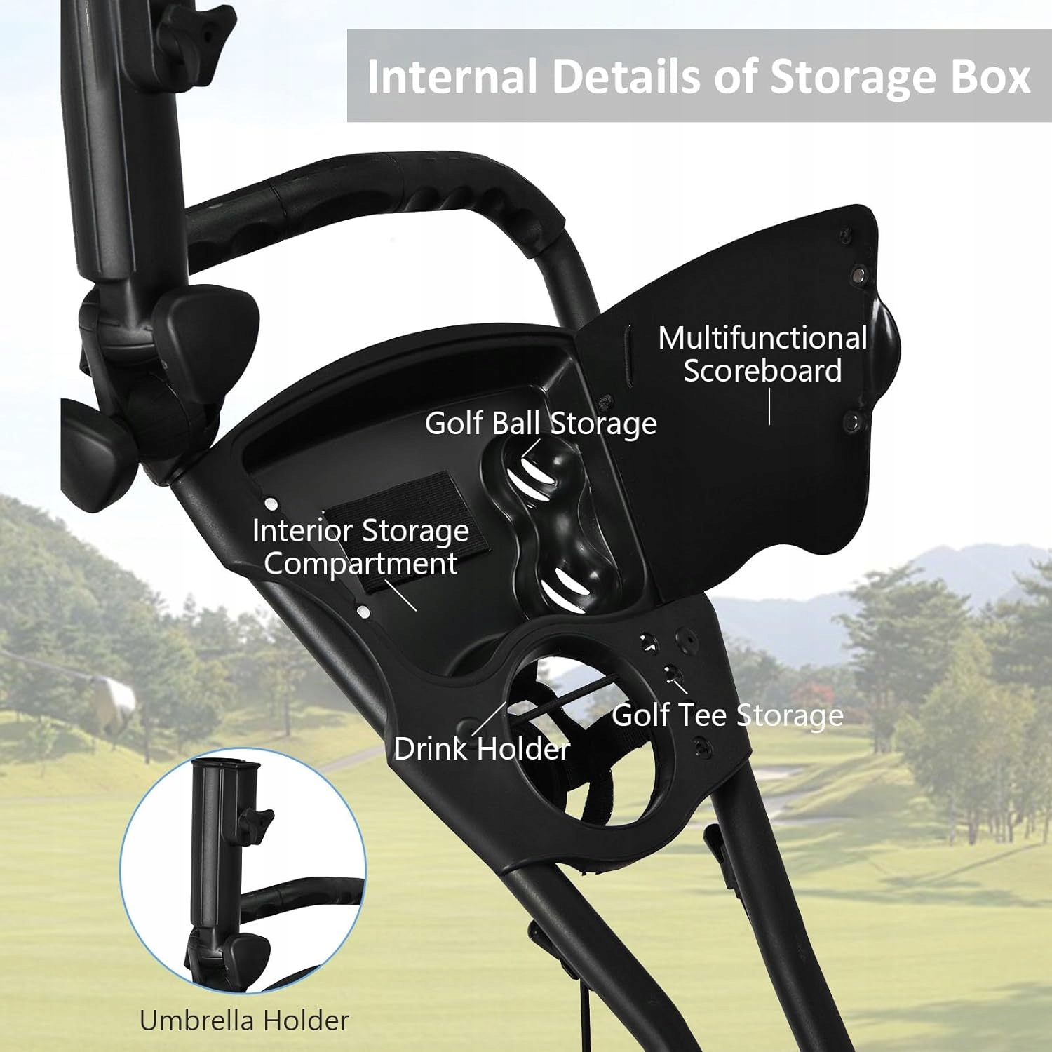 Наша гольф-кар станет вашим лучшим спутником в гольфе! С этой тележкой для гольфа вы можете перевозить все, что вам нужно во время игры, например, аксессуары, шляпу, комплект и т. д. Она включает в себя несколько мест для хранения вещей с сумкой для хранения, держателем устройства и демонстрационной панелью. Гольф-кар оснащен легкой, но прочной алюминиевой рамой, которая обеспечивает больший комфорт при использовании и обеспечивает надежную поддержку для сумок для гольфа большого размера. Аксессуары с резиновой рукояткой, которая хорошо впитывает пот, что делает эту гольф-кар незаменимой вещью для игры в гольф. Дополнительный держатель зонта можно отрегулировать в нужном положении, чтобы блокировать свет во время или после игры.
