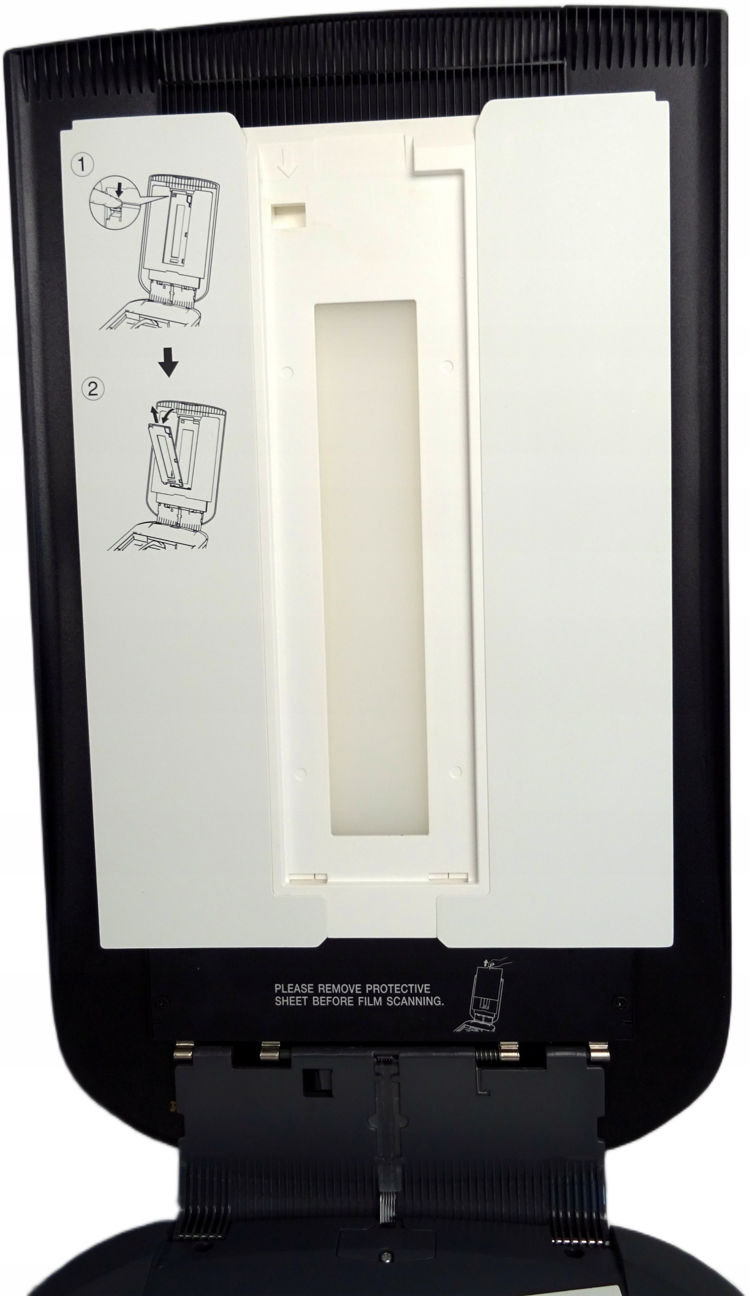 - Важная информация (сканирование пленки): В данной модели встроен в крышку модуль подсветки (ФАУ), спрятанный под белой крышкой. Однако помните, что в комплект поставки НЕ входит пластиковая рамка (направляющая) для слайдов/пленок. Для использования функции сканирования пленки вам необходимо купить рамку самостоятельно или сделать ее самостоятельно.