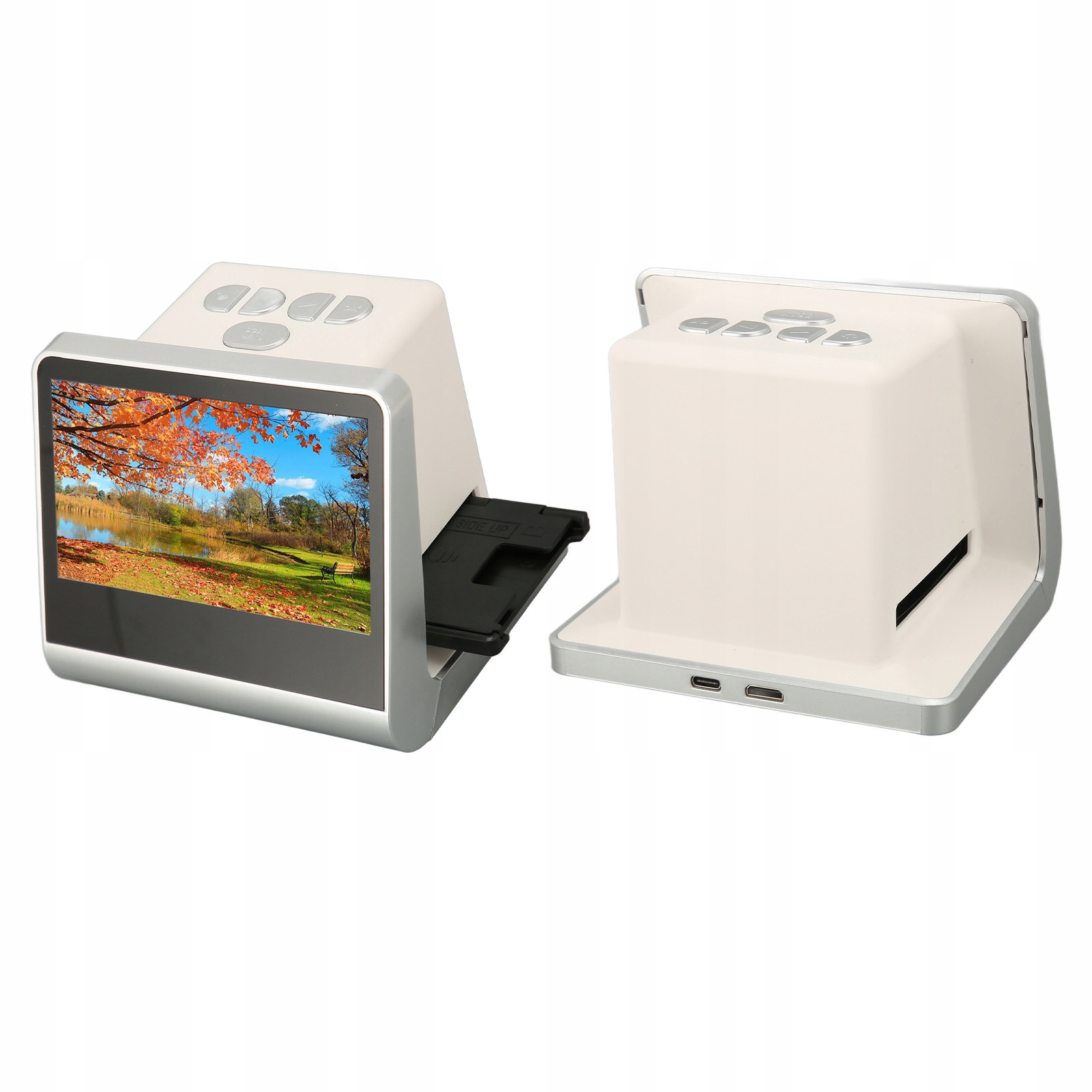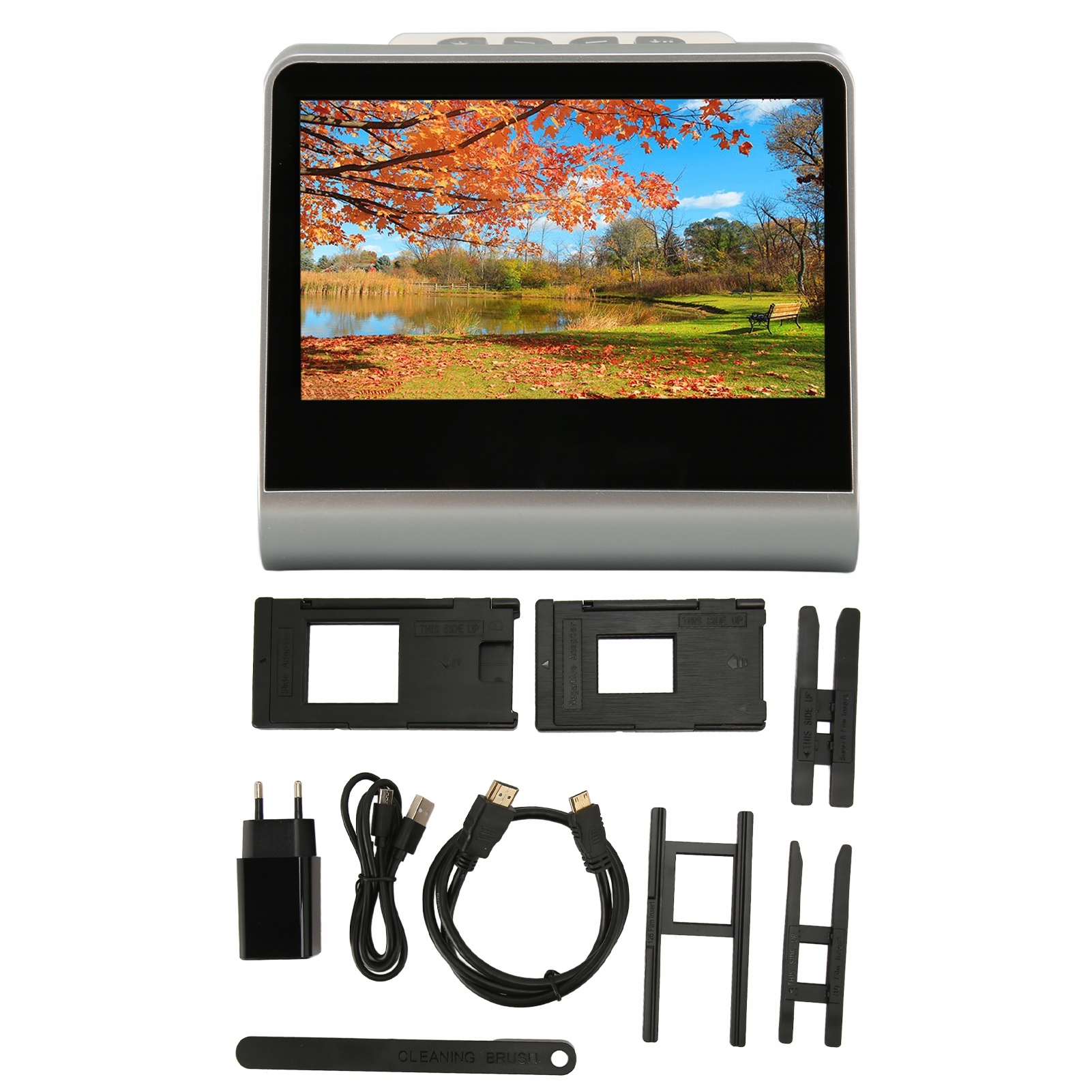2. 5-дюймовый HD-экран цвета: этот слайд-сканер был оснащен 5-дюймовым экраном HD, который позволяет вам предварительно просмотреть в режиме реального времени и редактировать фотографии. Включает в себя мини -мультимедийный интерфейсный кабель HD, который можно легко подключить к монитору, компьютеру и ноутбуку.