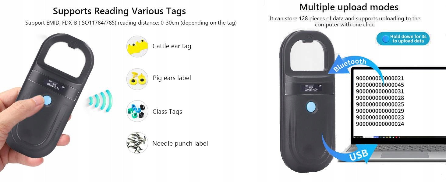 Рабочий диапазон: ➡︎ Этот портативный читатель идентификации животных поддерживает микрочип ISO11784 85 FDX-B ID64 с рабочей частотой 134,2 кГц и расстоянием считывания 15 см.