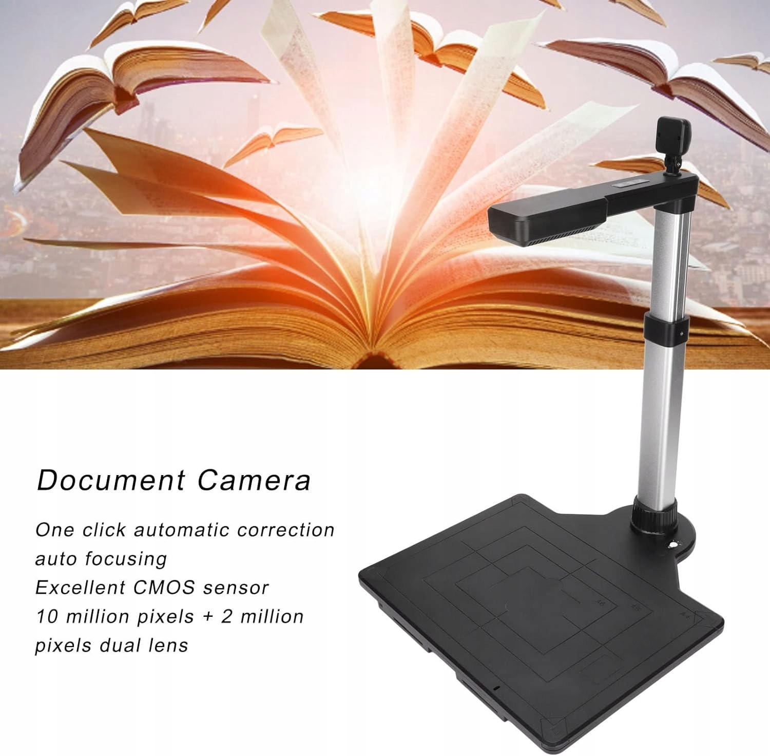 Автокоррекция Автоматическая коррекция одним щелчком мыши, даже если изображение искривлено, позволяет интеллектуально исправить изображение. Автоматическое пакетное сканирование просто переворачивает страницы вручную и непрерывно сканирует в изображения, что может повысить эффективность рабочего процесса. Превосходный CMOS-сенсор 10 миллионов пикселей 2-миллионный CMOS-сенсор с двойной линзой захватывает изображения в реальном времени. Четкая встроенная светодиодная подсветка позволяет получать изображения в темных и светлых условиях, равномерное освещение и интеллектуальный заполняющий свет. Распознавание текста OCR. Документ-камера использует передовую технологию оптического распознавания символов для прямого преобразования захваченных изображений документов в текст со скоростью распознавания более 98, отображает изображения в формате A3 A4, поддерживает распознавание символов и чисел на нескольких языках и может быть экспортирована в редактируемые файлы. . Живая проекция и видеозапись. Проекция и запись видео в реальном времени, подходящие для дистанционного обучения и онлайн-обучения, например, преподавания нот и деловых встреч. Простой в использовании сканер документов имеет корпус из высококачественного алюминиевого сплава. Он складной и портативный, просто подключите сканер к компьютеру с помощью USB-кабеля.