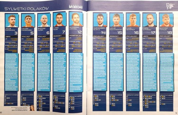 Описание: «Сокровище болельщика», подготовленное командой журналистов «Przegląd Sportowy» к финалу мужского чемпионата мира по волейболу 2022 года, который состоялся в Словении и Польше. В издании представлена каждая сборная (состав команды, тексты о команде и ее ведущем игроке, биография тренера с фото, информация об успехах, графики с основным составом). Кроме того, «Сокровище болельщика» содержит дополнительный текст о сборной Польши, интервью с Себастьяном Свидерским – президентом Польской волейбольной ассоциации, подробную презентацию каждого польского волейболиста, расписание турниров, презентацию арен чемпионата мира и небывалая статистика чемпионатов мира по волейболу.