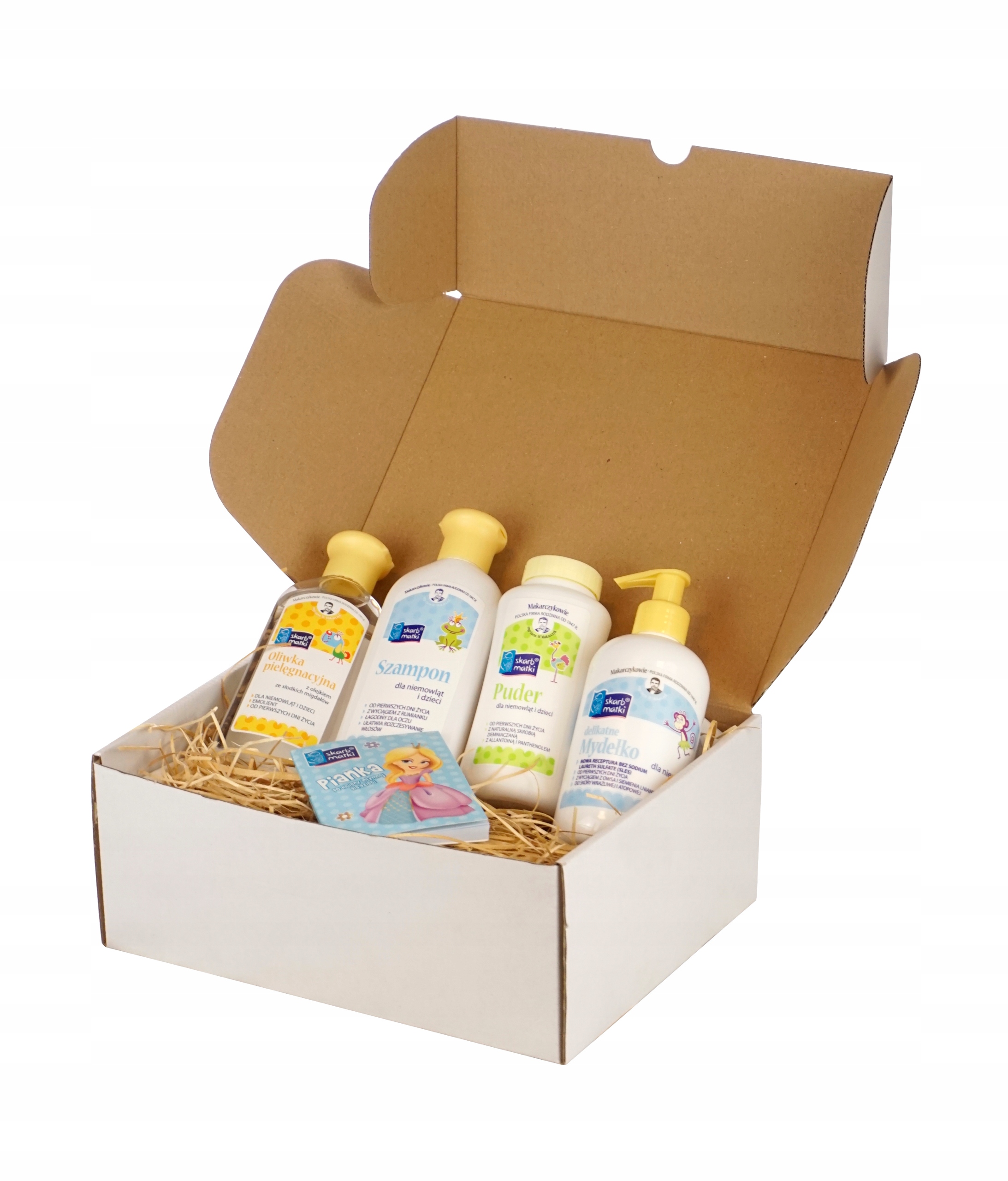 Косметика упакована в белую коробочку с сеном, так что ее можно подарить непосредственно молодой маме, например, на детский праздник. В наборе использована наиболее часто выбираемая косметика для новорожденных.