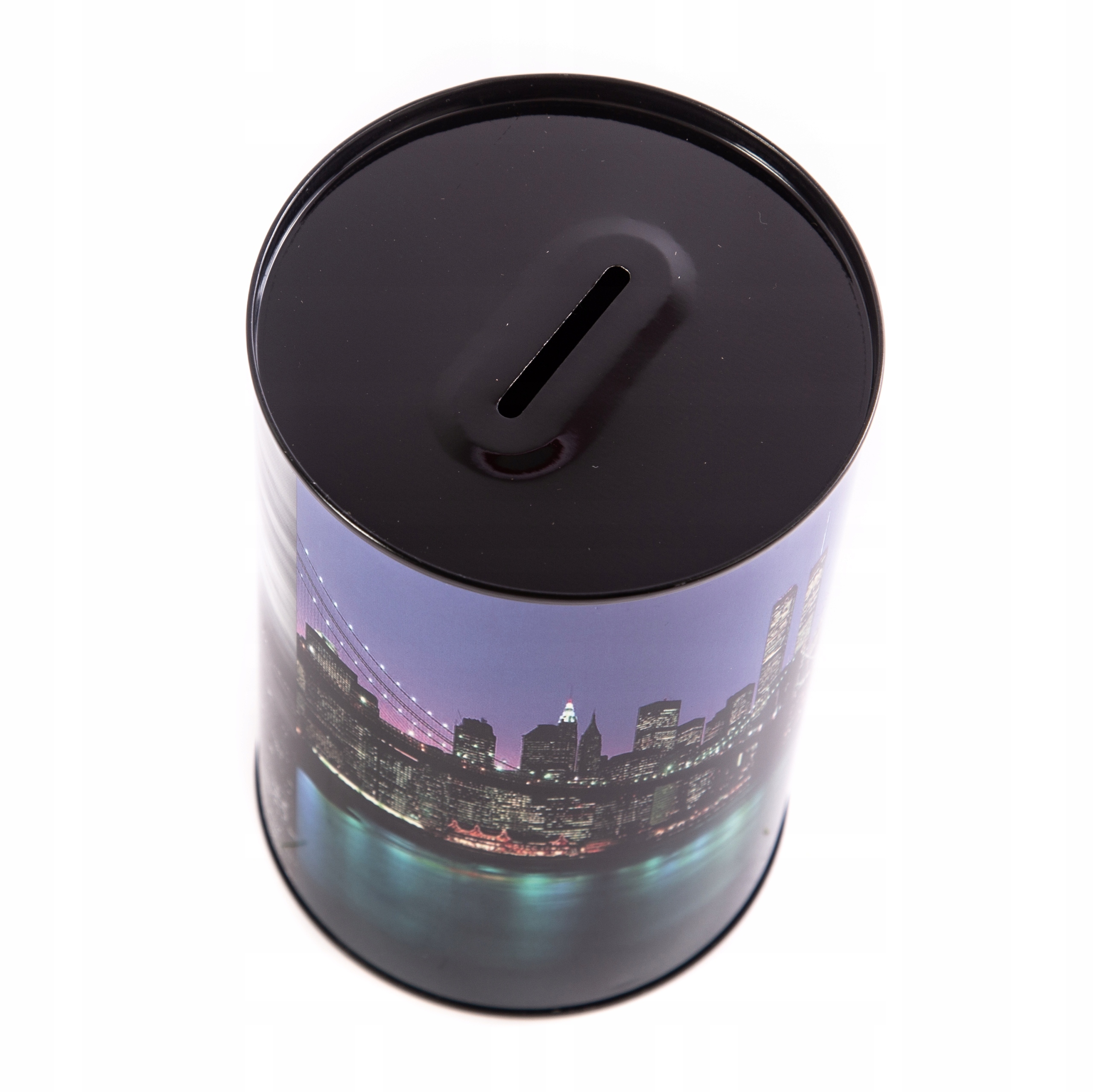 Металлическая копилка с красочной графикой.