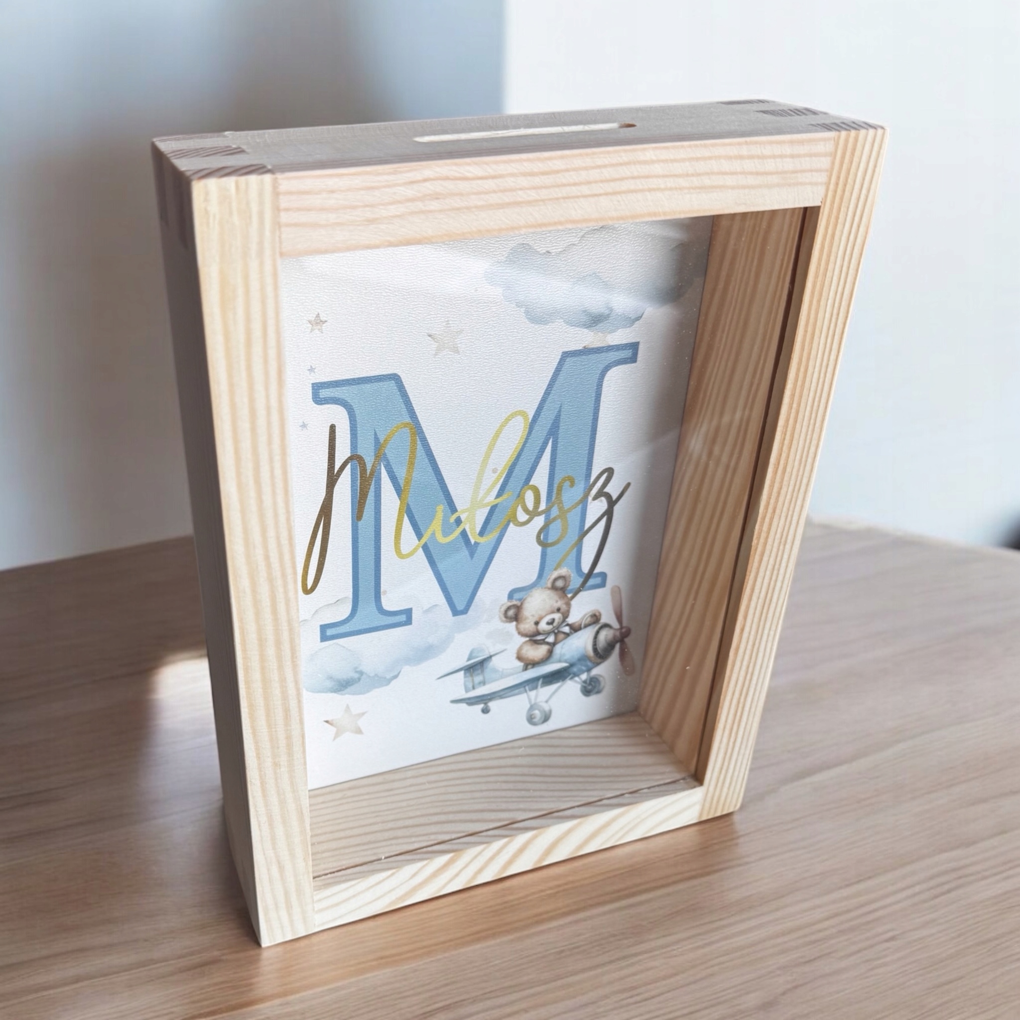 Деревянный пигги -берег для подачи крещения с именем ультрафиолетового отпечатка