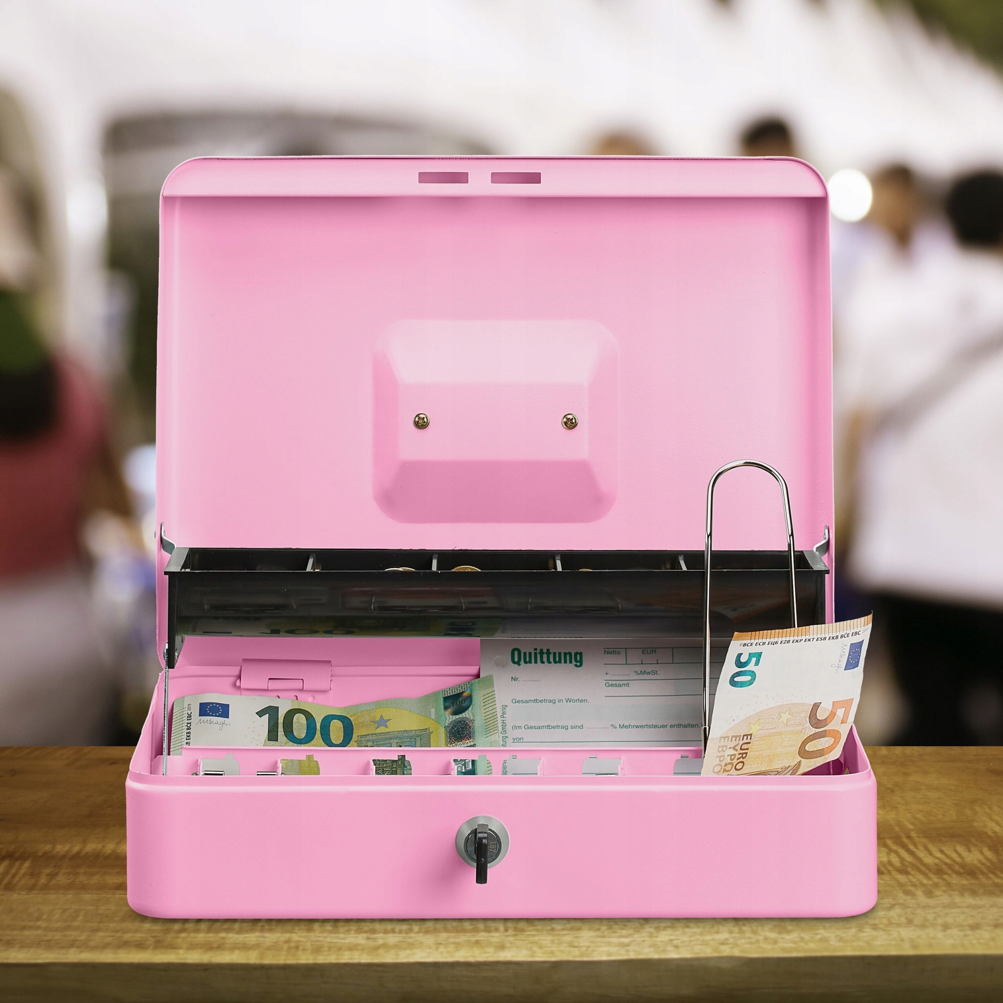 Будь то акция, блошиный рынок или ярмарка — ваши деньги всегда будут надежно храниться в этом запираемом кассовом аппарате без необходимости прибегать к сложной кассовой системе. Копилка имеет 5 отделений для монет и 4 отделения для купюр, что позволяет сортировать деньги по стоимости. Кассовый аппарат изготовлен из прочного железа с цветным порошковым покрытием и легко транспортируется с помощью выдвижной ручки.