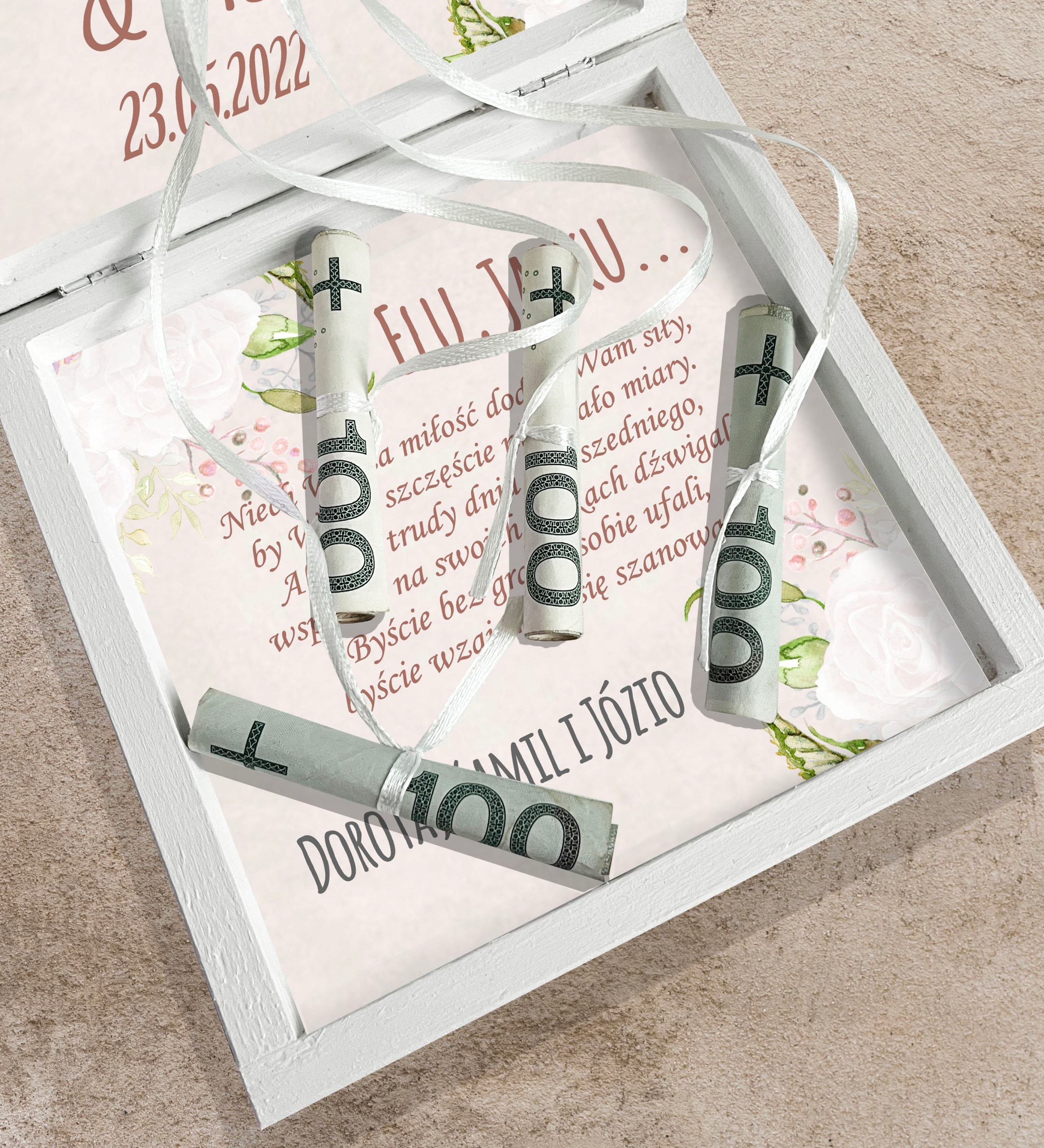 Шкатулка для купюр, являющаяся прекрасной альтернативой традиционному «конверту», представляет собой идеальное сочетание всех особенностей идеального свадебного подарка. Богатое содержание непременно станет практичным подарком, а персонализированная коробочка с именами и датами будет отвечать эстетическим требованиям. Это сувенир на долгие годы!