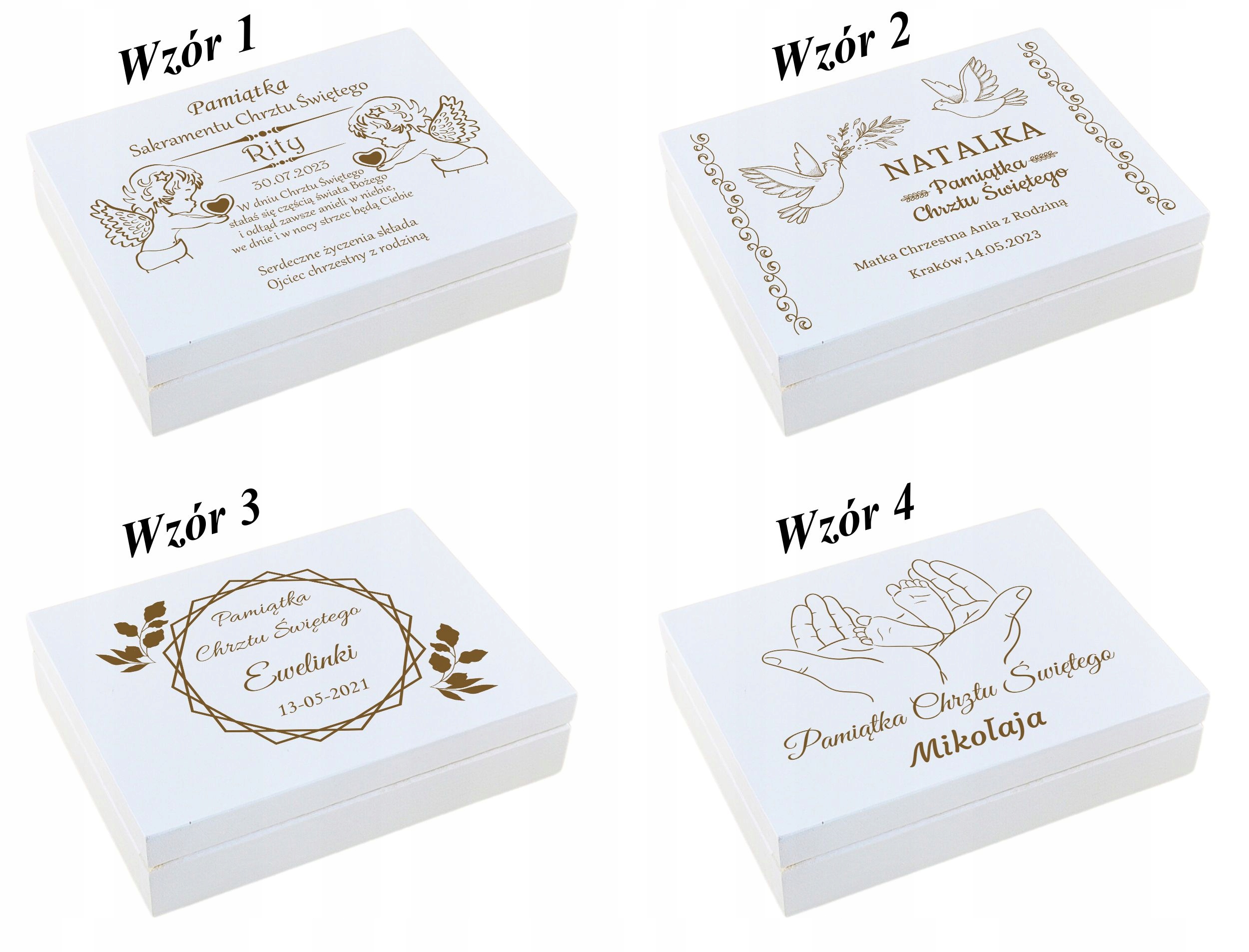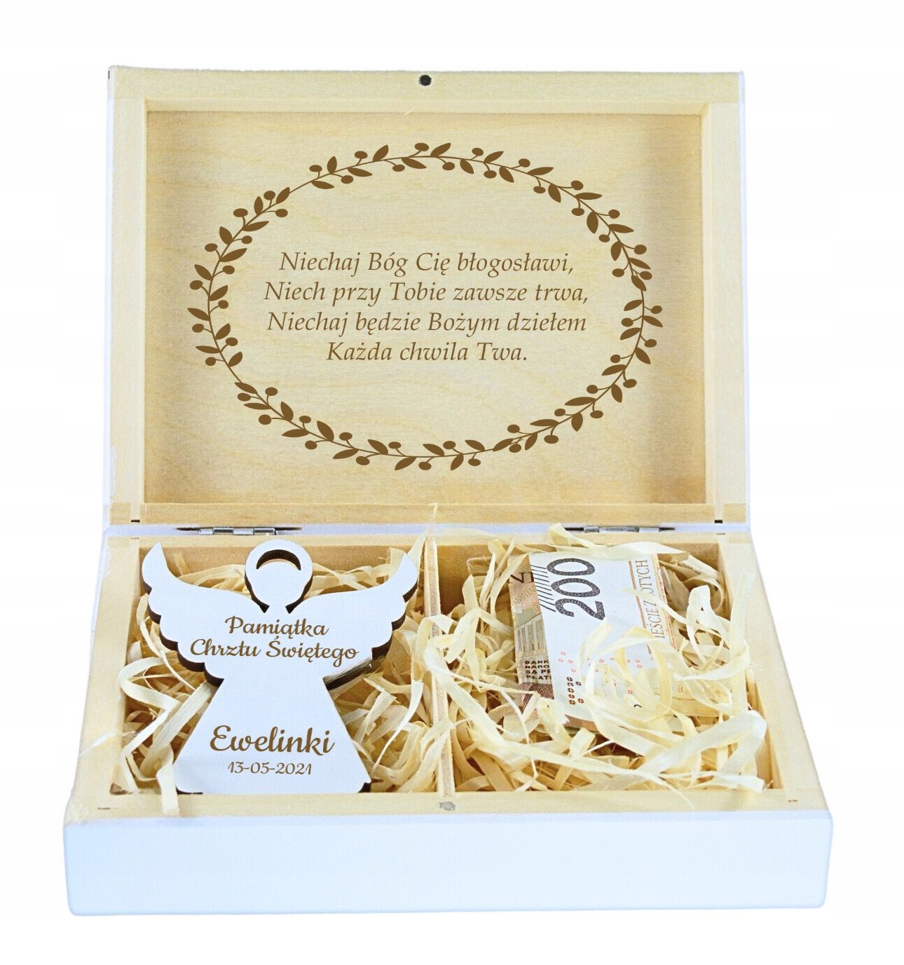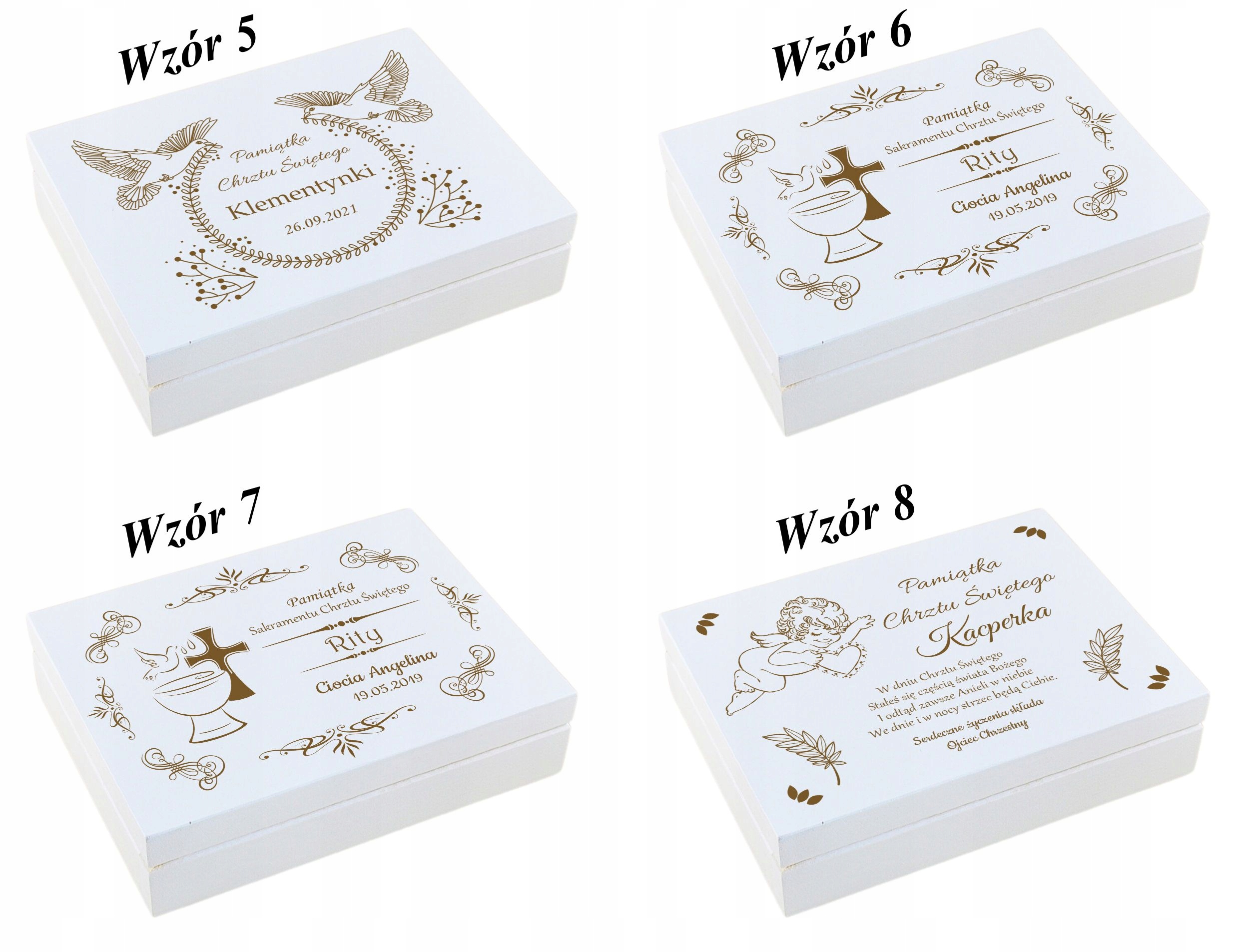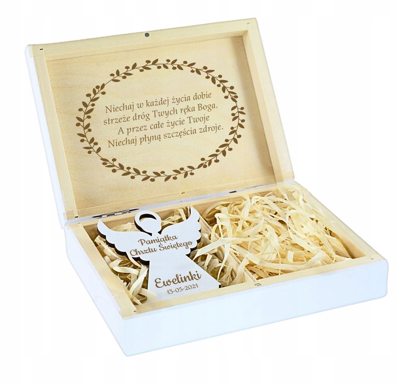 Сувенир на Крещение в виде красивой коробки – интересная идея подарка на Святое Крещение или Первый Год. В комплект входит магнит в форме ангела, на котором выгравировано название и дата торжества. На крышке коробки мы можем выгравировать индивидуальное посвящение на основе подготовленных ниже шаблонов.