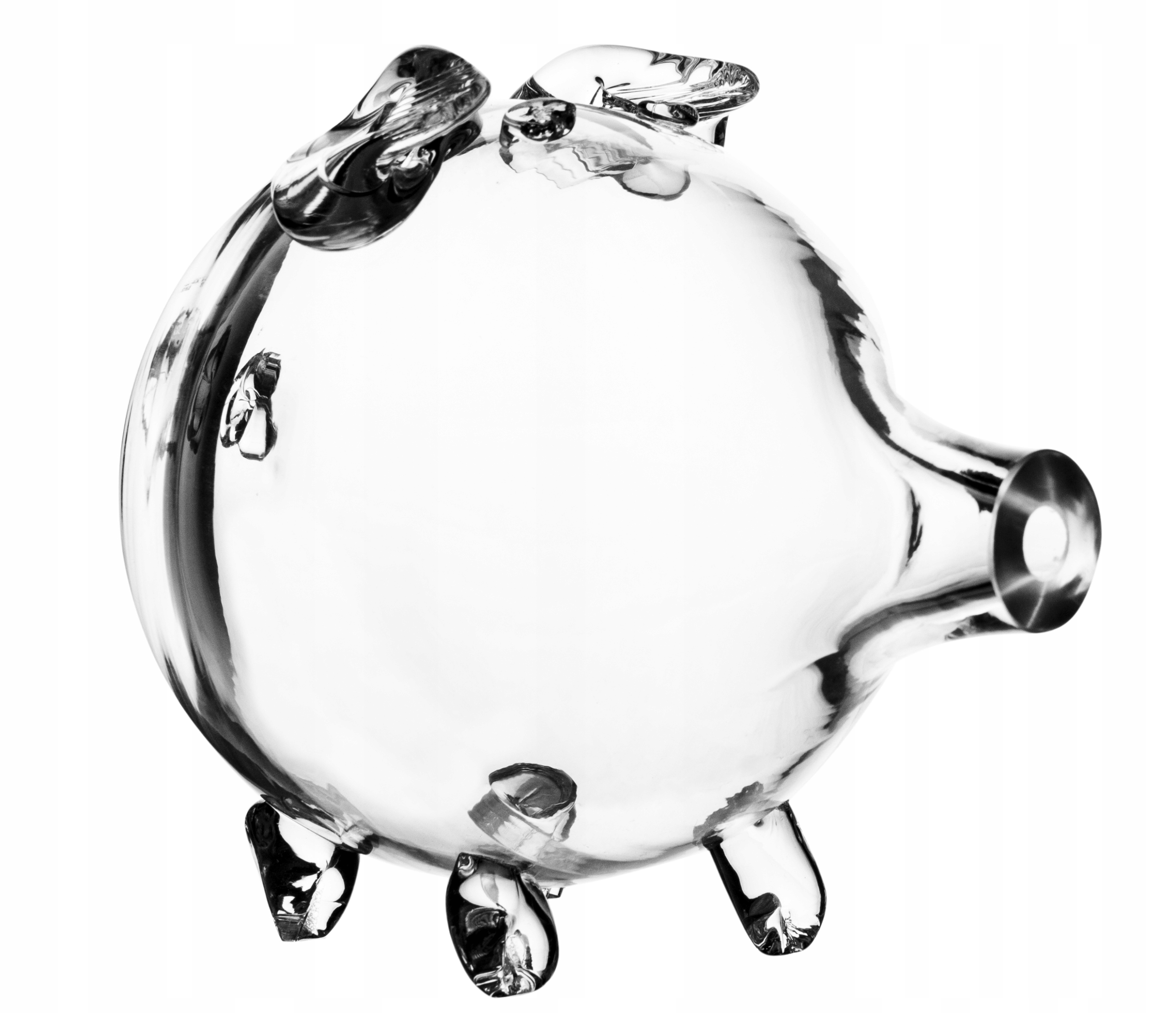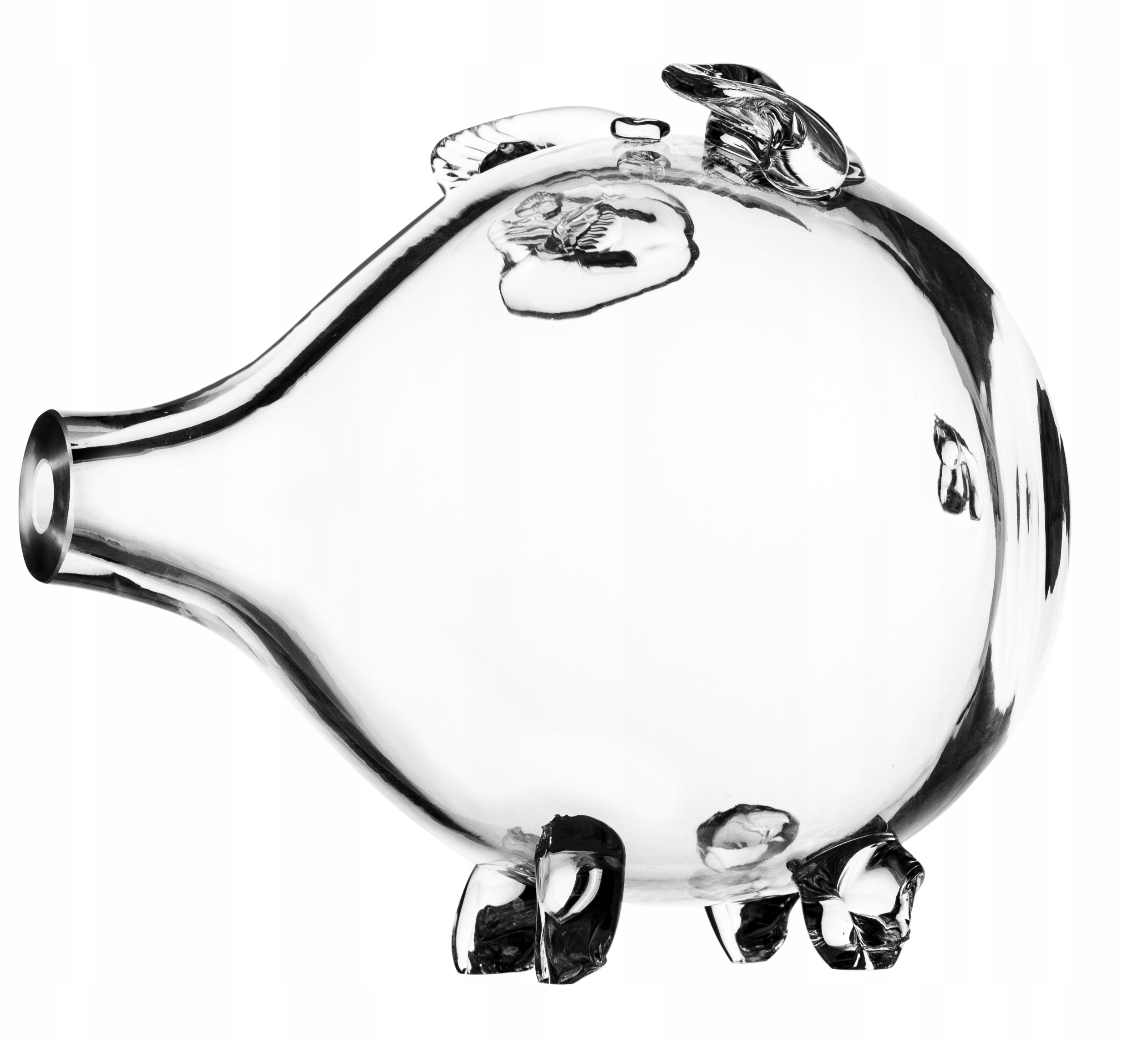 Копилка. Изготовлен из стекла с красивой, бесцветной и блестящей стеклянной поверхностью. Польский продукт. У свиньи есть отверстие – прорезь вверху для вставки монет. Единственный способ достать сдачу – разбить ее.