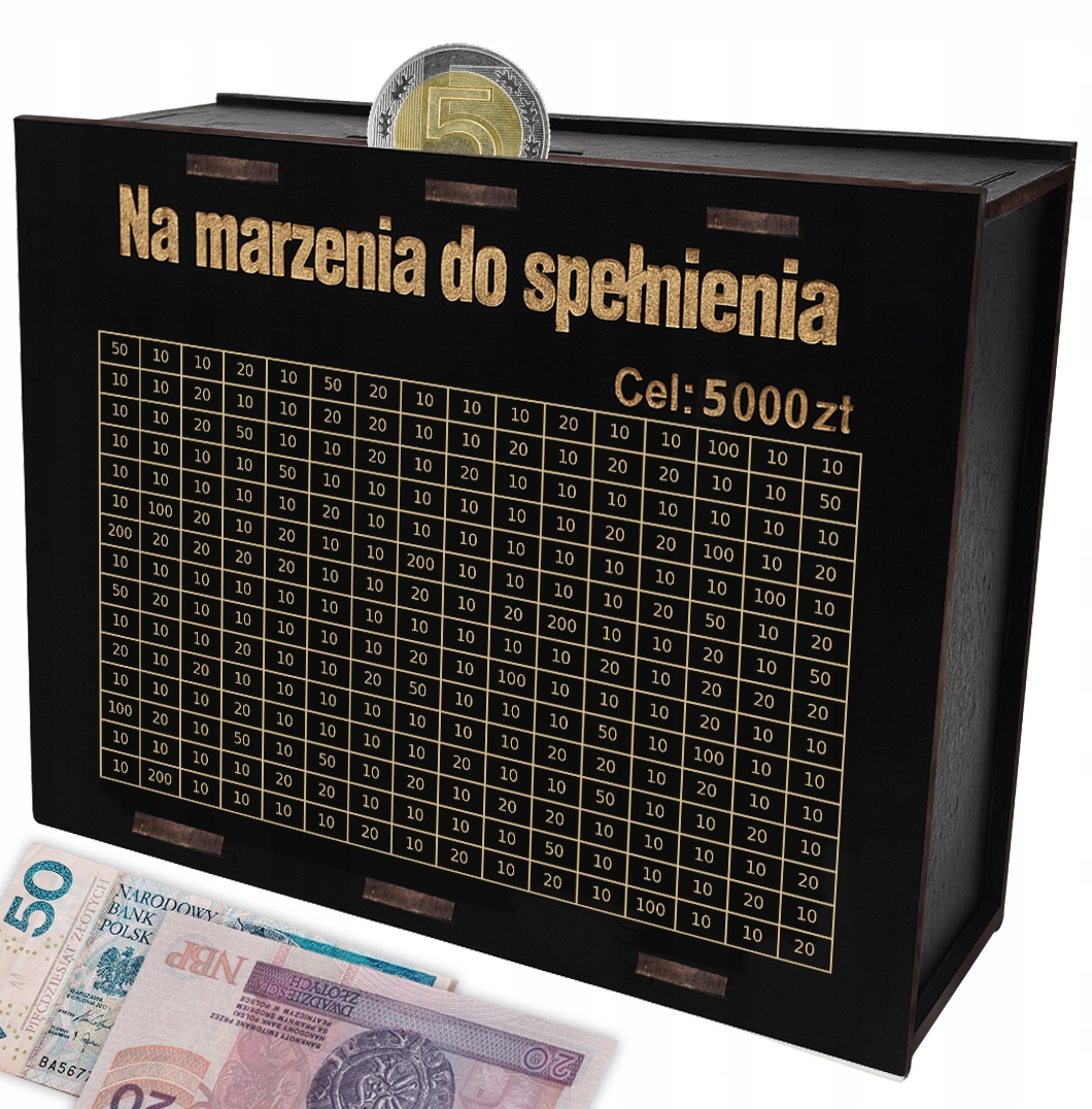 В передней части копилки находится специальная доска с суммами. Каждый раз, когда вы вносите деньги, вы пересекаете соответствующее поле. Благодаря этому вы сможете увидеть реальный прогресс и получить дополнительный импульс экономить больше.