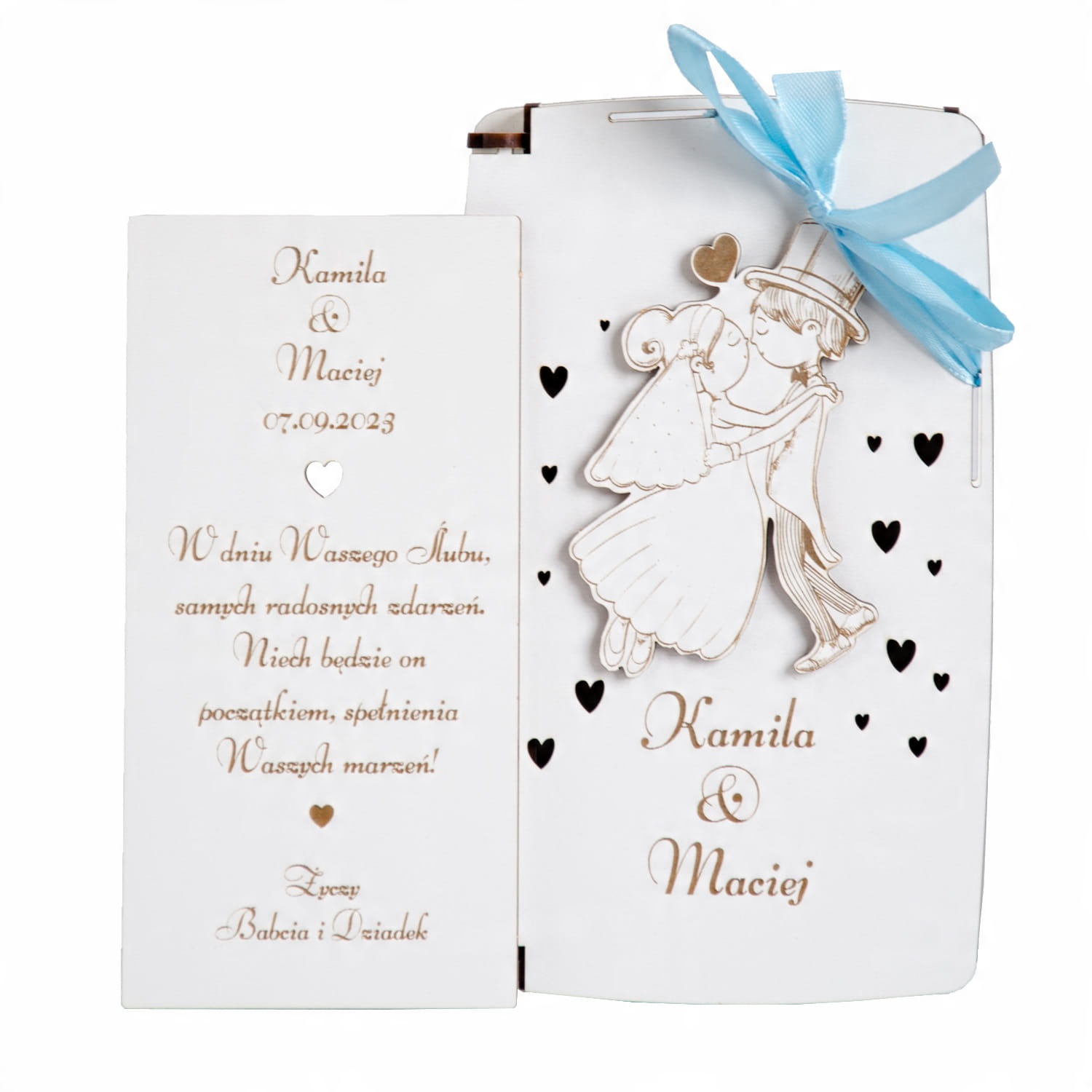 Имена жениха и невесты указаны на внешней стороне коробки.