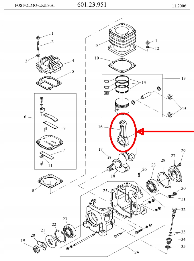 Полный кривошип для производственных компрессоров f.o.s. "Polmo" Лодзи С.А. Тип 601.22 .., 601.23 ... (после изменения) с разбрасыванием брызговика. Компрессоры имеют коленчатые клочки с подшипником.