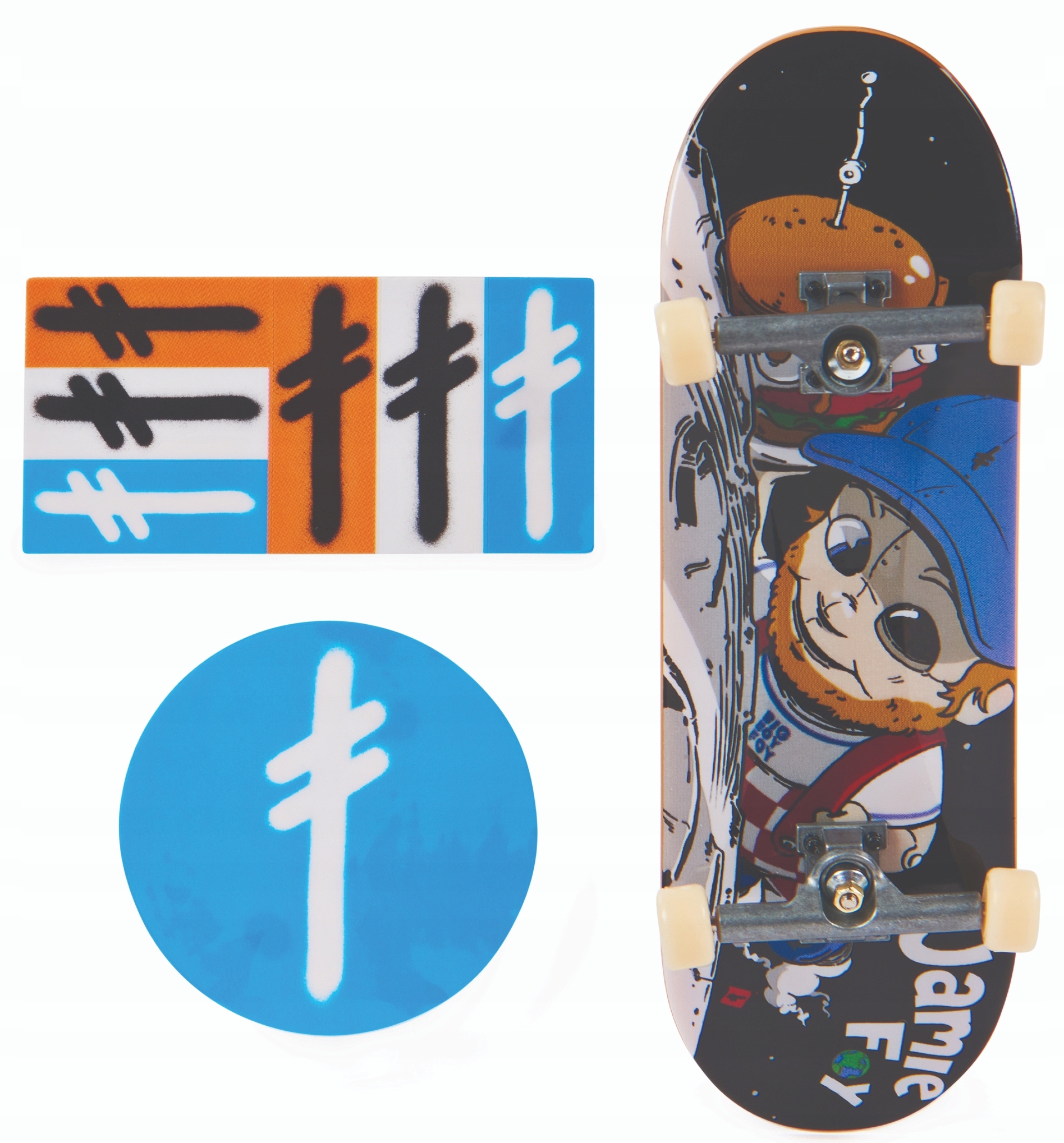 Набор включает в себя сложный технический скейтборд с иллюстрацией и наклейки.
