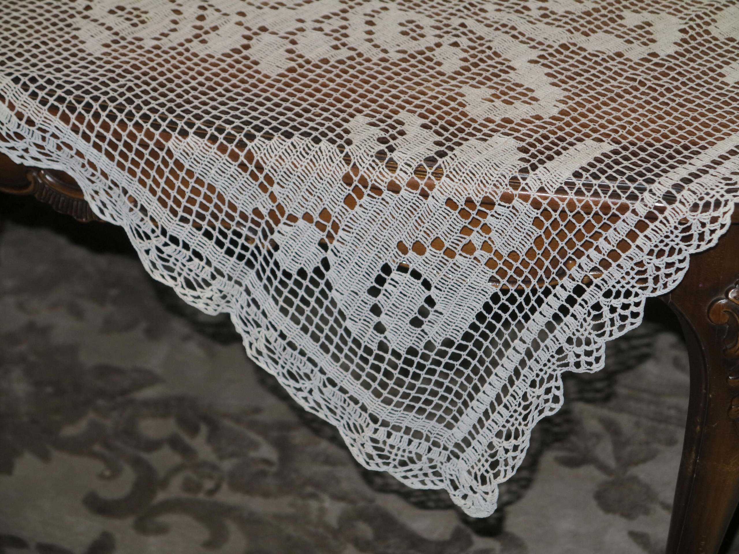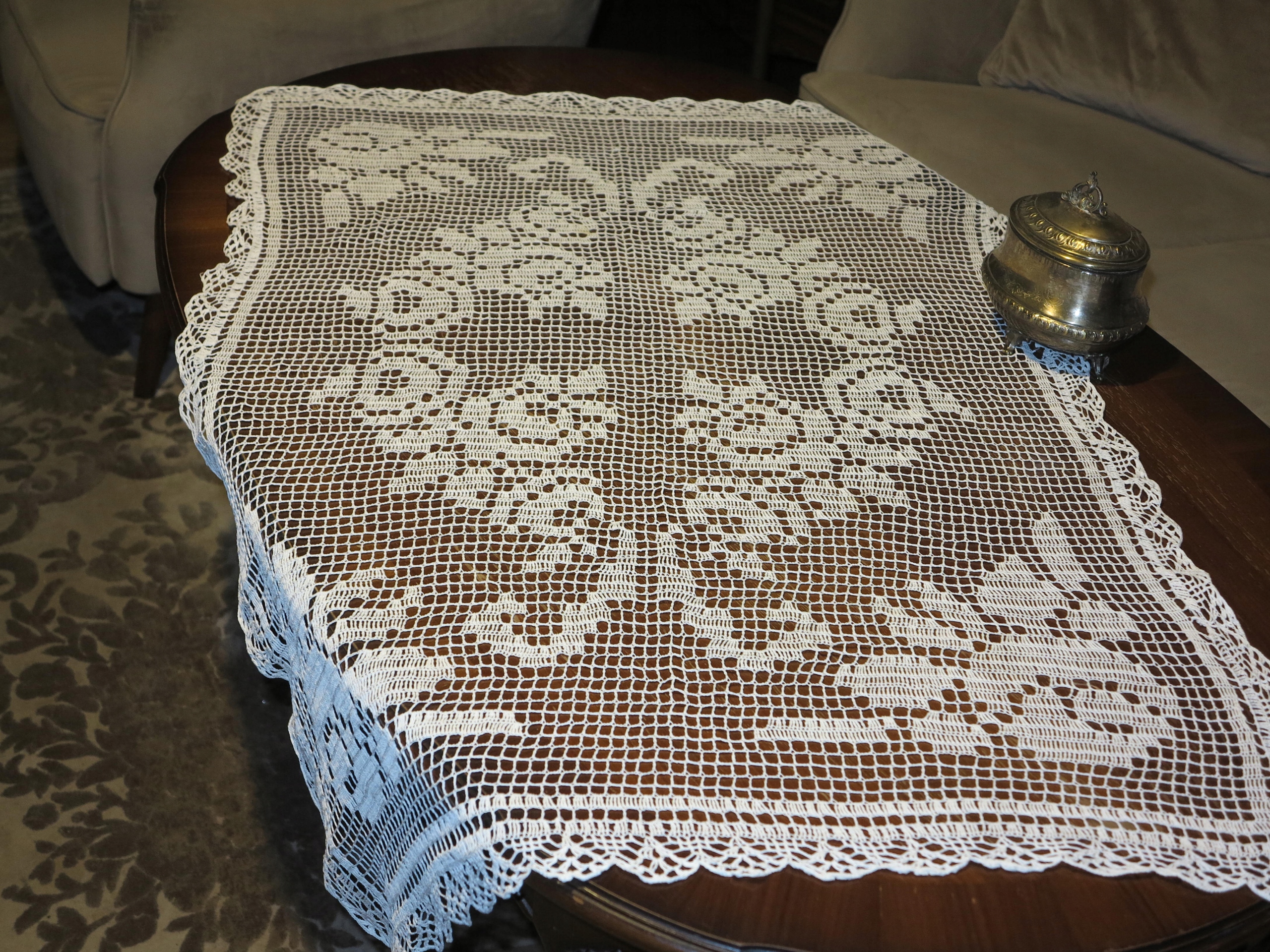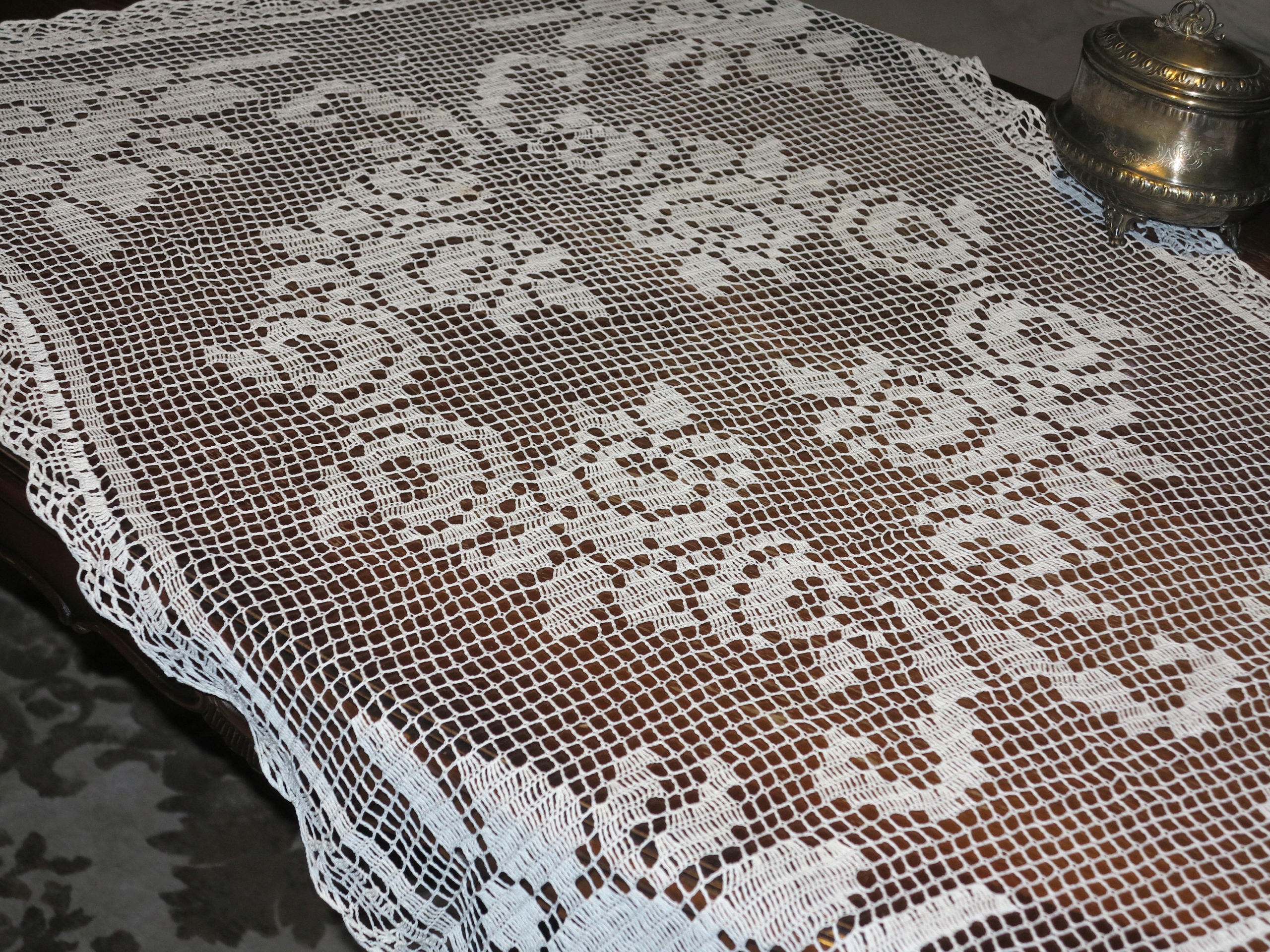 ИЗДЕЛИЕ РУЧНОЙ РАБОТЫ - КРАСИВЫЙ БЕЛЫЙ СКАТЕРЬ ИЗ ХЛОПКОВОЙ НИТИ. ИНТЕНСИВНАЯ РУЧНАЯ РАБОТА. ОЧЕНЬ ДЕКОРАТИВНЫЙ УЗОР С ВЕНКОМ ИЗ РОЗ, ТАКЖЕ РОЗЫ ПО УГЛАМ