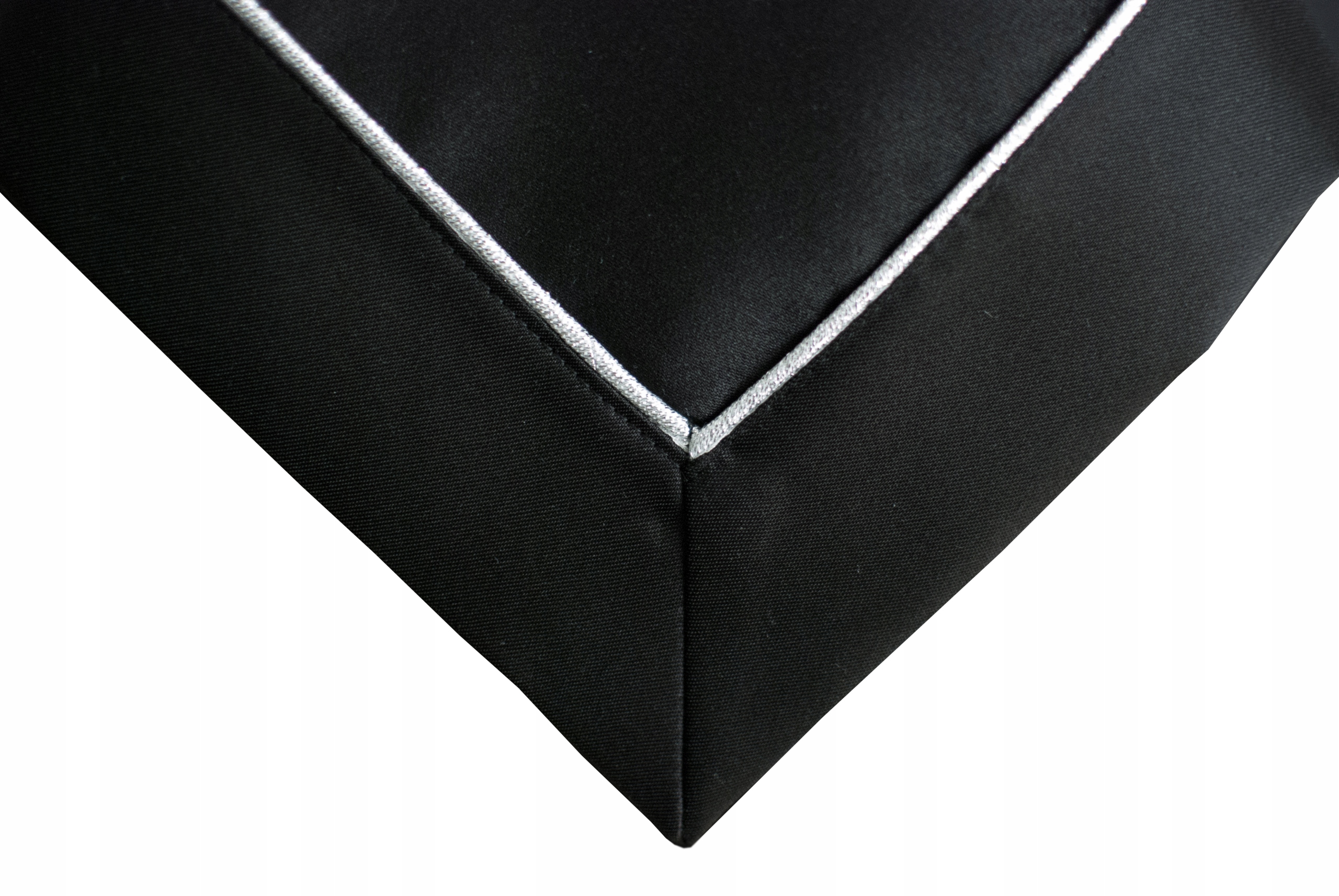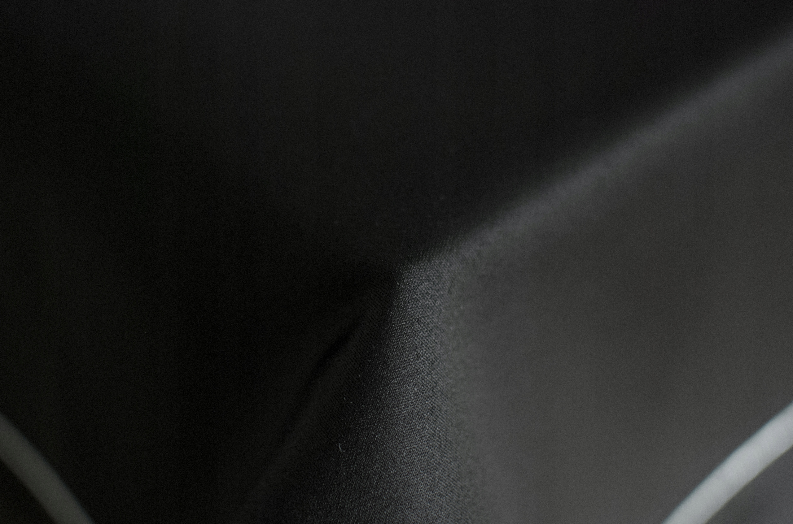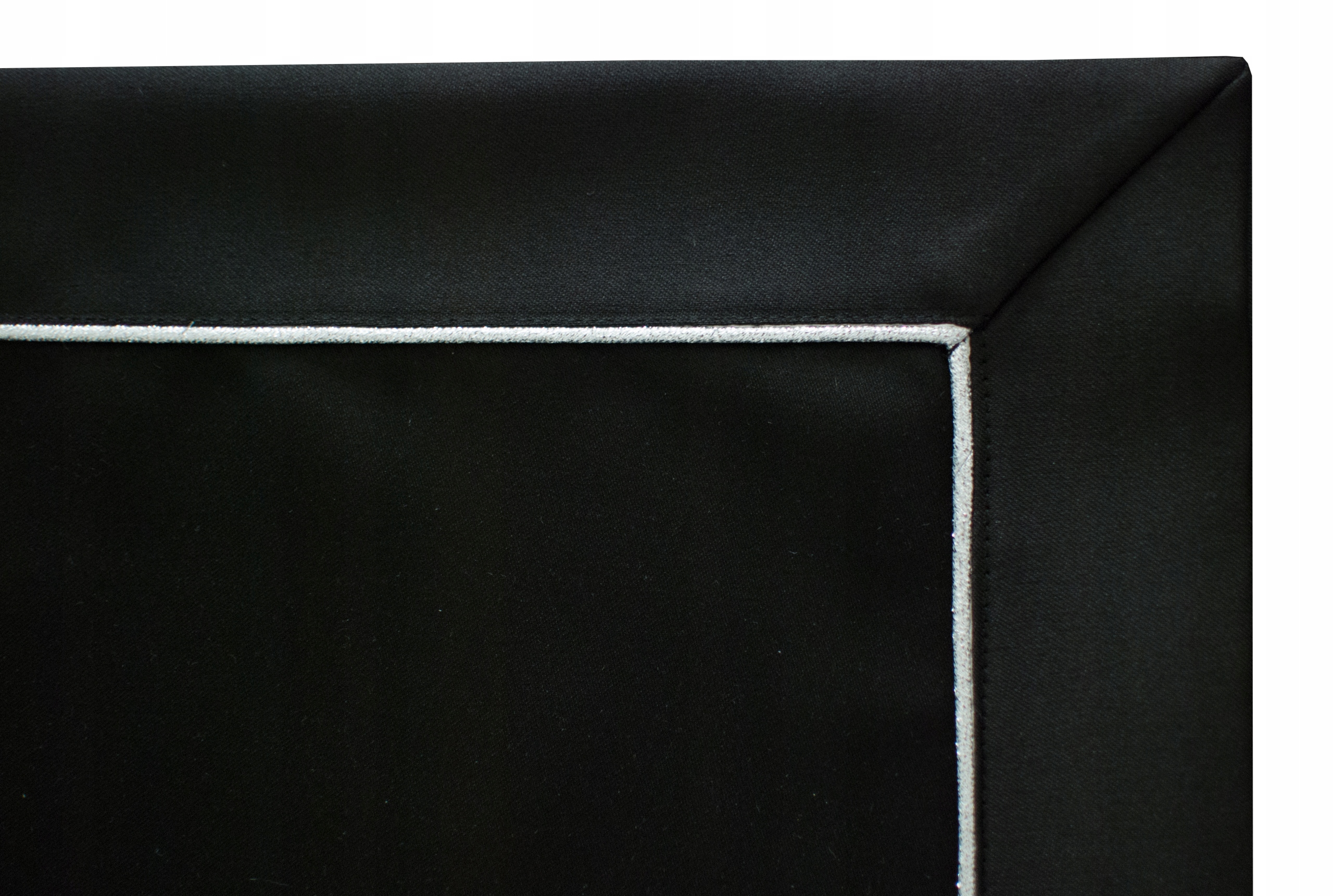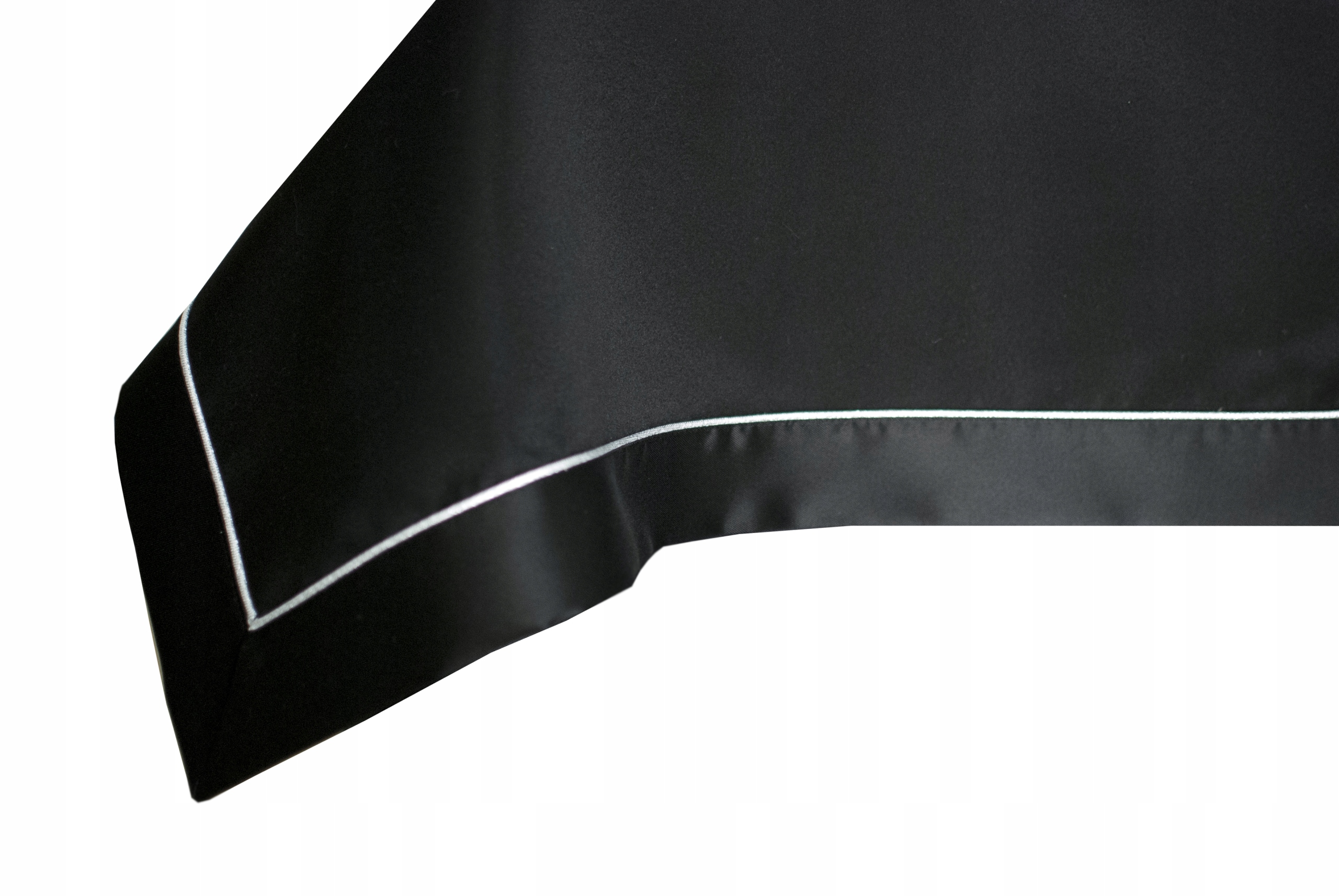 Роскошная черная грязеотталкивающая скатерть с потрясающим блеском. Скатерть украшена чрезвычайно изящным манжетом-конвертом (планкой), украшенным золотой, парчовой вставкой. Планка – это когда нижняя сторона ткани вывернута на лицевую сторону. Она имеет другой оттенок и свет на нее падает по-другому, что является настоящим украшением скатерти. В то же время он утяжеляет скатерть и не дает ей соскальзывать со стола.