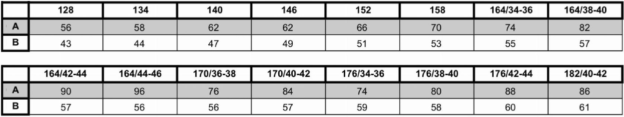 В заглавной строке указано название размера, для которого все значения параметров указаны в см.