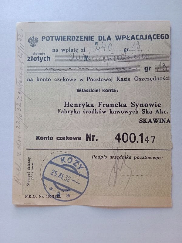 SKAWINA KOZY КВИТАНЦІЯ 1932 R 1137 D1