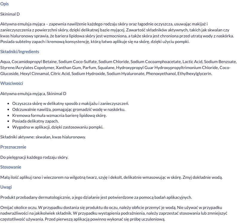 Просматривая «Skinimal D, активная эмульсия для мытья, 200 мл», вы можете быть уверены, что данный товар из каталога «Очищение и очищение» будет доставлен из Польши и проверен на целостность. В цене товара, указанной на сайте, учтена доставка из Польши. Внимание!!! Товары для Евросоюза, согласно законодательству стран Евросоюза, могут отличаться упаковкой или наполнением.