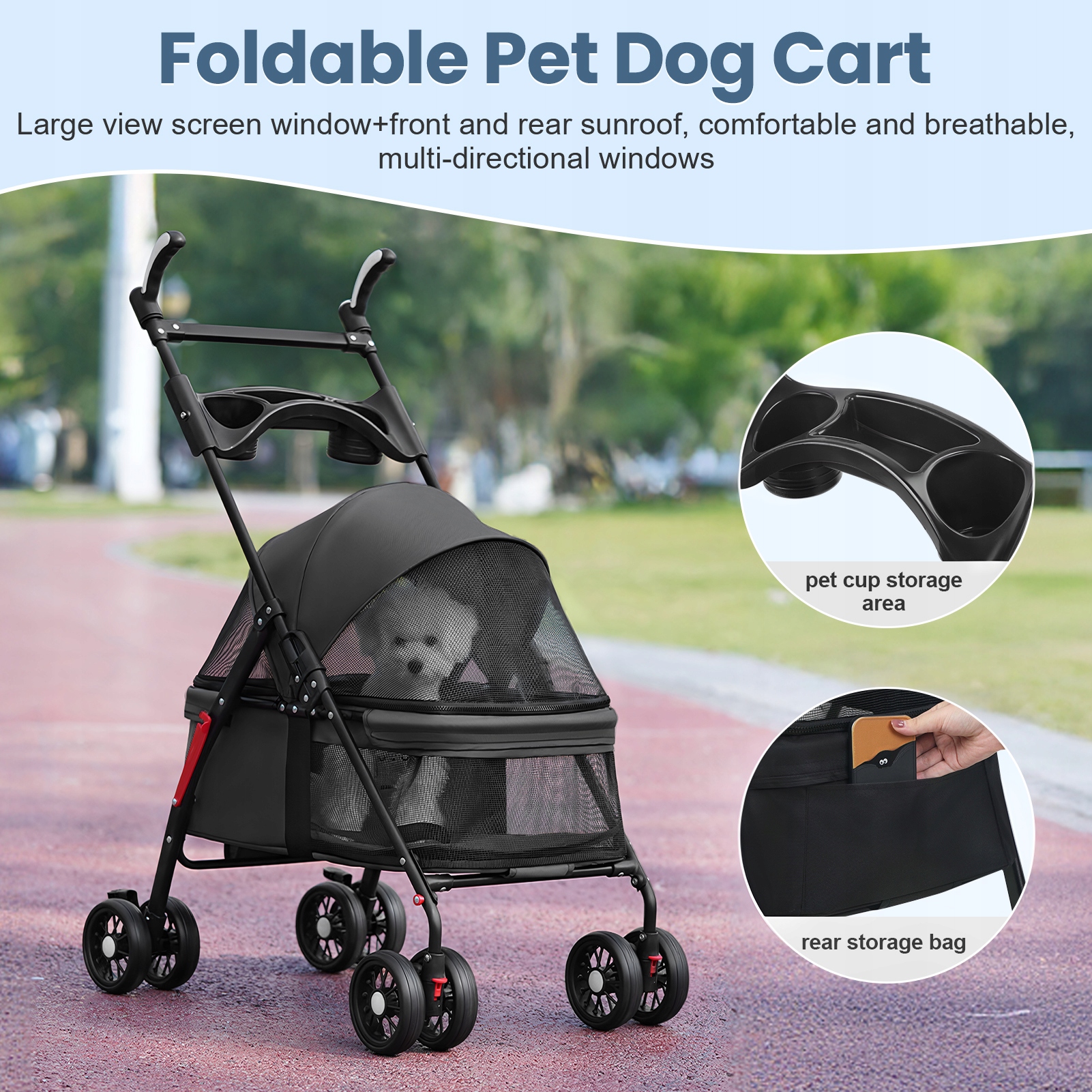 Эта 4-колесная коляска для собак предлагает удобное решение для хранения вещей, оснащенная многофункциональным подстаканником для размещения чашек и еды, а также задней сумкой для хранения предметов первой необходимости, таких как зонтики и смартфоны, чтобы все необходимые предметы были под рукой.