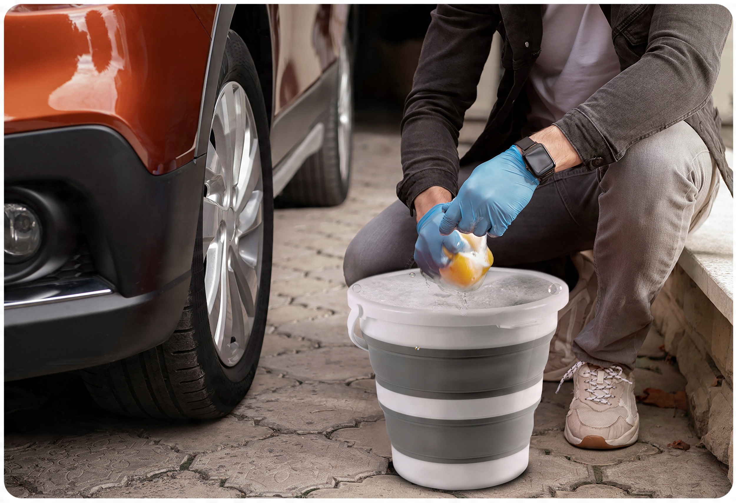 Складное ведро чрезвычайно практично при мытье автомобиля. Легко хранить, идеально подходит в качестве контейнера для воды или чистящих средств. Вы также можете хранить в нем все аксессуары для ухода за автомобилем, что упрощает организацию и экономит место.