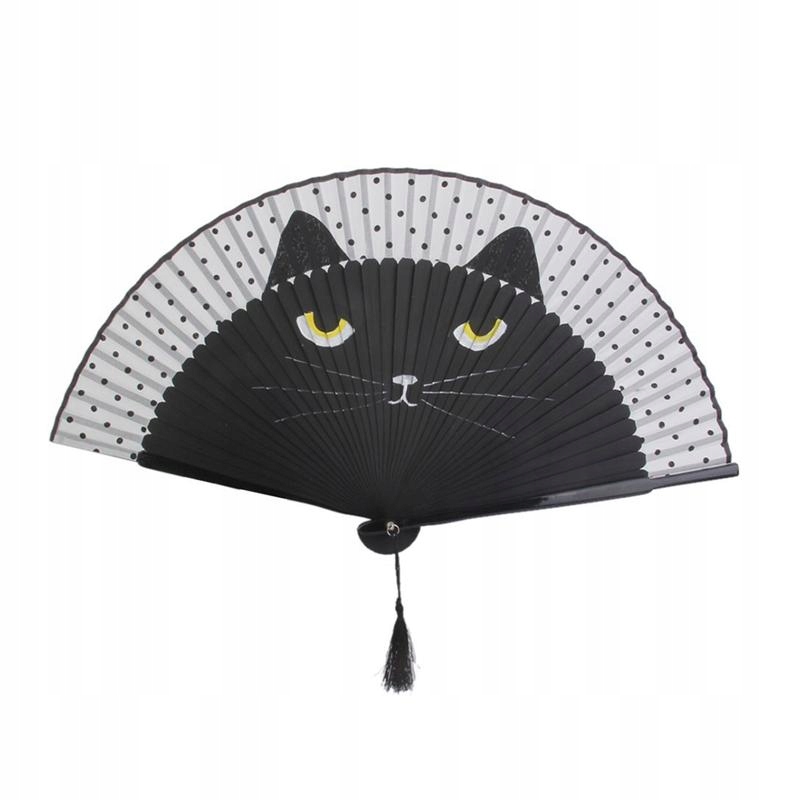 Этот предмет представляет собой портативный складной веер, изготовленный из бамбука и шелка. Кулон с кисточкой делает его милым и уникальным. Раскрашенные вручную узоры черных кошек, подходящие для девочек или поклонников аниме. Отлично подходит для украшения, отправки в подарок, в коллекцию, на свадьбу и т. д.