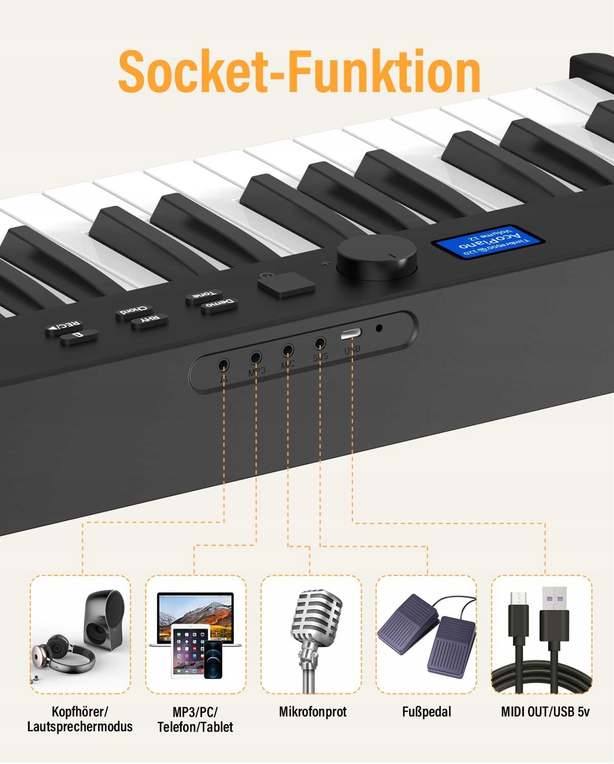 белая складная клавиатура цифровой пианино 88 полные клавиши -size, Bluetooth Connectivity H1>