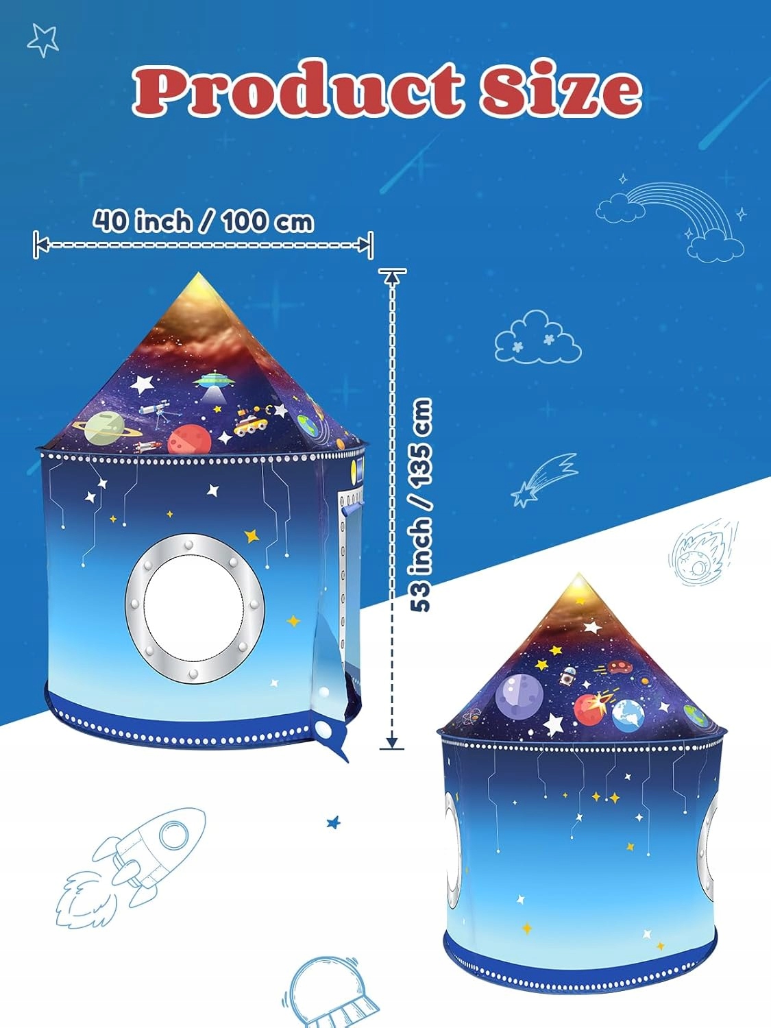 Возьмите своего ребенка в путешествие по звездам! Эта синяя палатка с космическим мотивом - ракетами, планетами и звездами - является уникальным местом для игры, которое стимулирует воображение и передает младшего в мир приключений.
