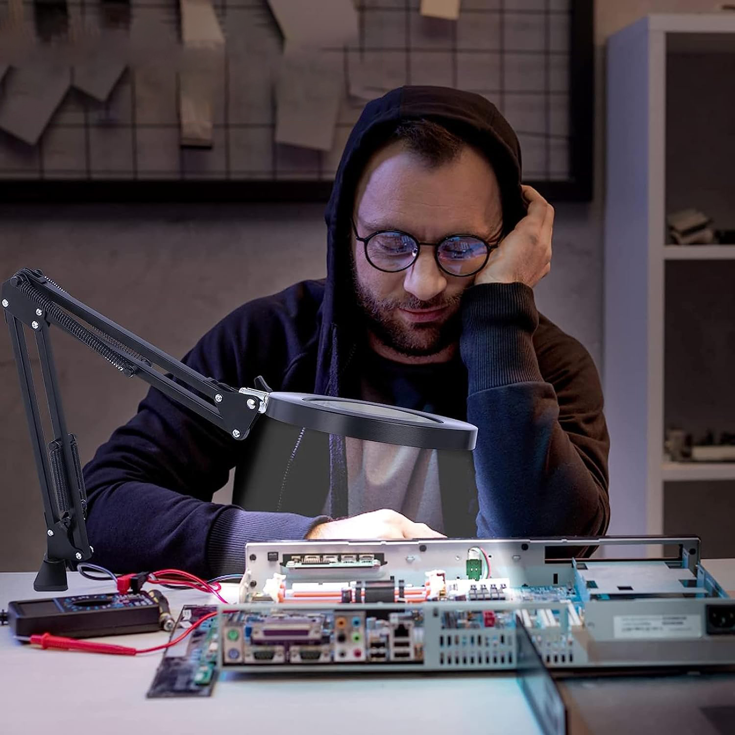 Настольная лампа с увеличительным стеклом оснащена 72 яркими светодиодами и 3 цветными режимами: прохладный свет, теплый свет и смешанный свет. Каждый режим освещения имеет 10 уровней затемнения, которые можно отрегулировать в зависимости от ваших потребностей.