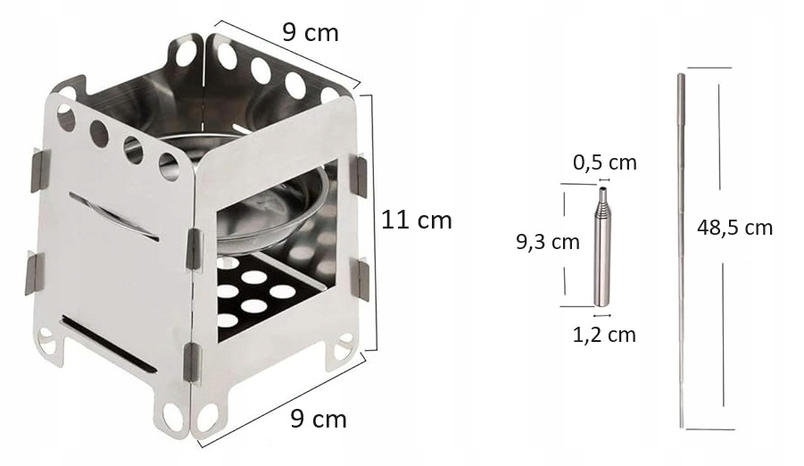 Благодаря профилированной чаше, пользователь имеет возможность удобно сжимать топливо , что облегчает освещение очага как можно более экономически, несмотря на его небольшой размер. Полное измерение, после развертывания, составляет до 48,5 см