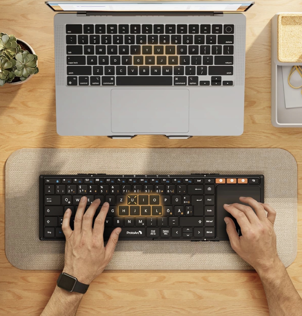 Откройте для себя удобство работы в дороге и дома с ProtoArc XK01 TP — современной складной Bluetooth-клавиатурой с немецкой раскладкой QWERTZ и большим трекпадом (тачпадом).