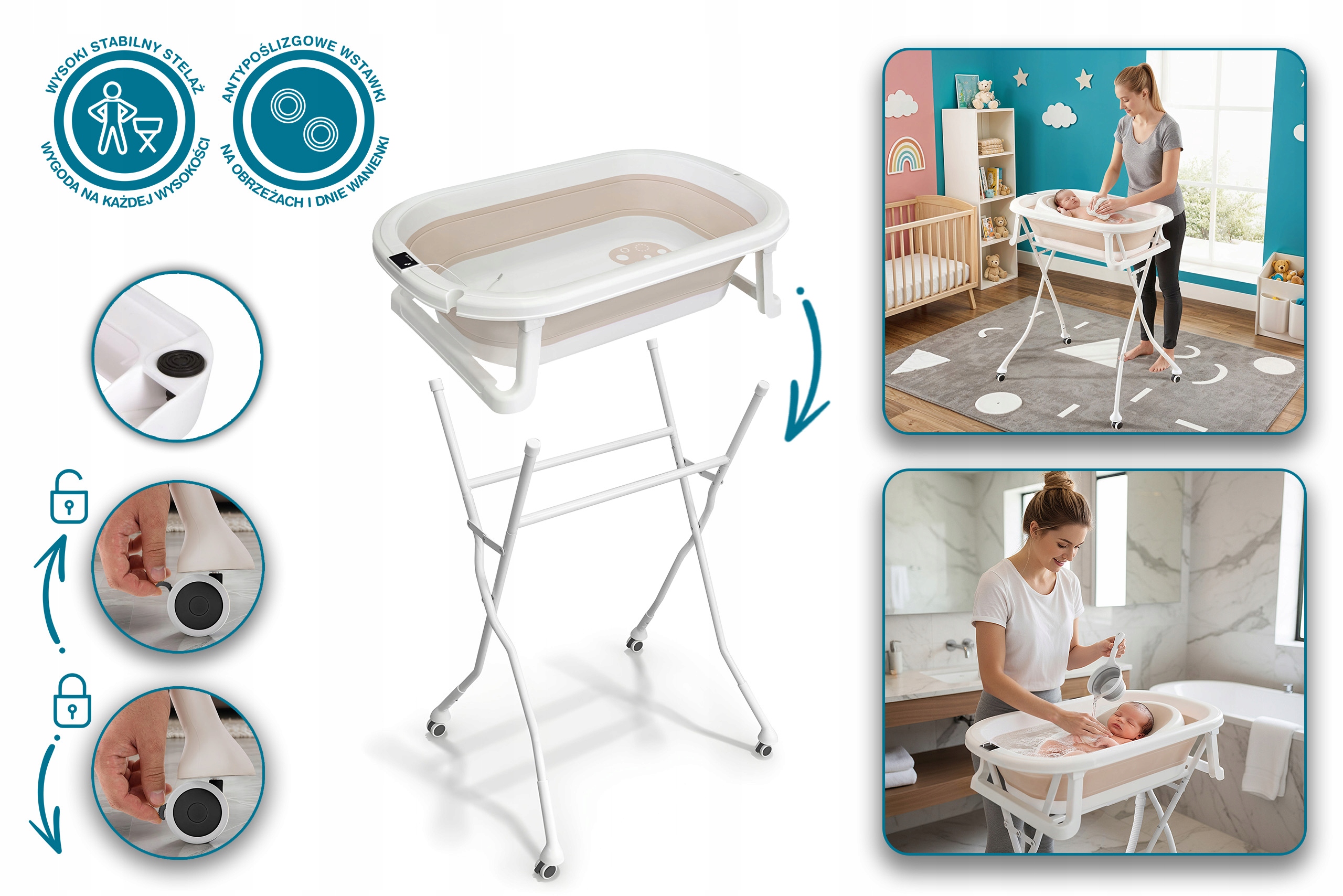 ✅ Блокируемые колеса предотвращают перемещение рамы. Разблокировав колеса, мы можем удобно переместить ванну в нужное место (никогда не перемещайте ванну, если она полная или когда внутри находится ребенок!).